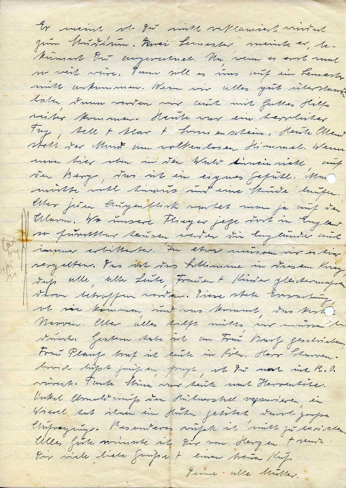 Er meint, ob Du nicht reklamiert würdest zum Studium. Zwei Semester, meinte er, bekämest Du angerechnet. Na, wenn es erst mal so weit wäre. Dann soll es uns auf ein Semester nicht ankommen. Wenn wir alles gut überstanden haben, dann werden wir auch mit Gottes Hilfe weiter kommen. Heute war ein herrlicher Tag, hell + klar + Sonnenschein. Heute Abend steht der Mond am wolkenlosen Himmel. Wenn man hier oben in den Wald hineinsieht, auf den Berg, das ist ein eignes Gefühl. Man möchte wohl hinaus und eine Stunde laufen. Aber jeden Augenblick wartet man ja auf den Alarm. Wo unsere Flieger jetzt dort in England so furchtbar hausen, werden die Engländer auch immer erbitterter. In etwa müssen wir es hier vergelten. Das ist das Schlimme in diesem Krieg, daß alle, alle Leute, Frauen + Kinder gleichermaßen davon betroffen werden. Diese stete Erwartung, ob sie kommen, und was kommt, das kostet Nerven. Aber alles hilft nichts, wir müssen hier durch. Gestern habe ich an Frau Bartz geschrieben. Frau Plantz traf ich heute in Köln. Herr Scharrenbroich läßt grüßen, fragt, ob Du noch [..] R.O. wärest. Tante Stina war heute nach Herrenhöhe. Onkel Arnold muß den Hühnerstall reparieren, ein Wiesel hat ihnen ein Huhn getötet, darob große Aufregung. Besonderes wüßte ich nicht zu berichten. Alles Gute wünsche ich Dir von Herzen + sende Dir viele liebe Grüße + einen treuen Kuß.