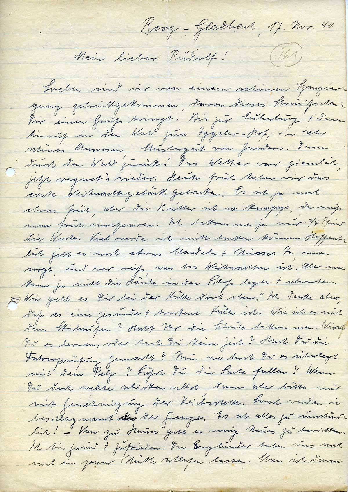 Soeben sind wir von einem schönen Spaziergang zurückgekommen, davon dieses Sträußchen Dir einen Gruß bringt. Bis zur Eulenburg + dann hinauf in den Wald zum Iggeler-Hof; ein sehr schönes Anwesen, Mustergut von Gunders. Dann durch den Wald zurück! Das Wetter war ziemlich, jetzt regnet’s wieder. Heute früh haben wir das erste Weihnachtsgebäck gebacken. Es ist ja noch etwas früh, aber die Butter ist so knapp, da muß man früh einsparen. Ich bekomme ja nur ¼ Pfund die Woche. Viel werde ich nicht backen können. Hoffentlich gibt es noch etwas Mandeln + Nüsse. Ja, man sorgt, und wer weiß, was bis Weihnachten ist. Aber man kann ja nicht die Hände in den Schoß legen + abwarten. Wie geht es Dir bei der Kälte dort oben? Ich denke aber, daß es eine gesunde + trockene Kälte ist. Wie ist es mit dem Skilaufen? Habt Ihr die Schuhe bekommen. Wirst Du es lernen, oder hast Du keine Zeit? Hast Du die Fahrerprüfung gemacht? Nun wie hast Du es überlegt mit dem Pelz? Läßt Du die Sache fallen? Wenn Du doch welche schicken willst, dann aber bitte nur mit Genehmigung der Reichsstelle. Sonst werden sie beschlagnahmt an der Grenze. Es ist alles zu umständlich! – Von zu Hause gibt es wenig Neues zu berichten. Ich bin gesund + zufrieden. Die Engländer haben uns noch mal ein paar Nächte schlafen lassen. Man ist dann