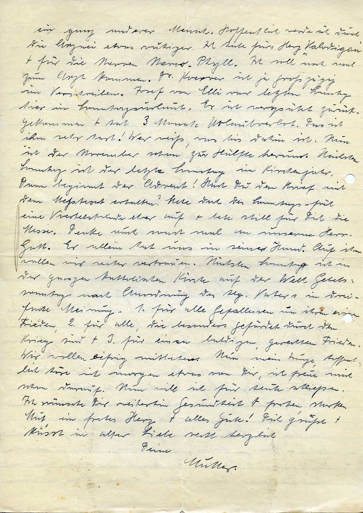 ein ganz anderer Mensch. Hoffentlich werde ich durch die Arznei etwas ruhiger. Ich habe fürs Herz „Valodigan“ + für die Nerven Nervo-Phyll. Ich soll noch mal zum Arzt kommen. Dr. Koerver ist ja großzügig im Verschreiben. Josef von Elli war letzten Sonntag hier in Sonntagsurlaub. Er ist verspätet zurückgekommen + hat 3 Monate Urlaubverbot. Das ist ihm sehr hart! Wer weiß, was bis dahin ist. Nun ist der November schon zur Hälfte herum. Nächsten Sonntag ist der letzte Sonntag im Kirchenjahr. Dann beginnt der Advent! Hast Du den Brief mit dem Meßtext erhalten? Stehe doch des Sonntags-früh eine Viertelstunde eher auf + bete still für Dich die Messe. Denke auch sonst mal an unseren Herr-Gott. Er allein hat uns in seiner Hand. Auf ihn wollen wir weiter vertrauen. Nächsten Sonntag ist in der ganzen katholischen Kirche auf der Welt Gebetssonntag nach Anordnung des hlg. Vaters in dreifacher Meinung. 1. für alle Gefallenen um ihren ewigen Frieden, 2. für alle, die besonders gefärdet durch den Krieg sind + 3. für einen baldigen, gerechten Frieden. Wir wollen eifrig mitbeten. Nun mein Junge, hoffentlich höre ich morgen etwas von Dir, ich freue mich schon darauf. Nun will ich für heute schließen.