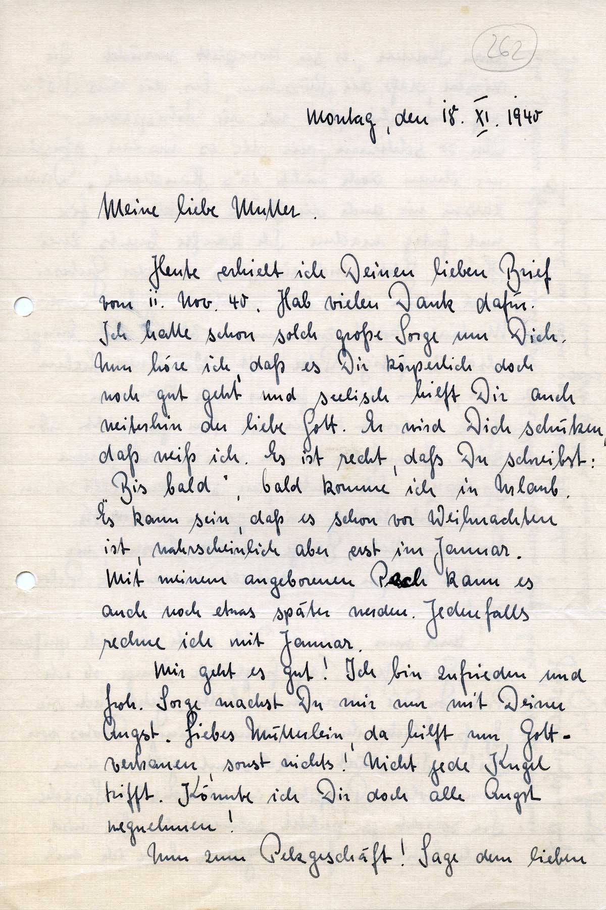 Heute erhielt ich Deinen lieben Brief vom 11. Nov. 40. Hab vielen Dank dafür. Ich hatte schon solch große Sorge um Dich. Nun höre ich, daß es Dir körperlich doch noch gut geht und seelisch hilft Dir auch weiterhin der liebe Gott. Er wird Dich schützen, daß weiß ich. Es ist recht, daß Du schreibst: „Bis bald“, bald komme ich in Urlaub. Es kann sein, daß es schon vor Weihnachten ist, wahrscheinlich aber erst im Januar. Mit meinem angeborenen Pech kann es auch noch etwas später werden. Jedenfalls rechne ich mit Januar.