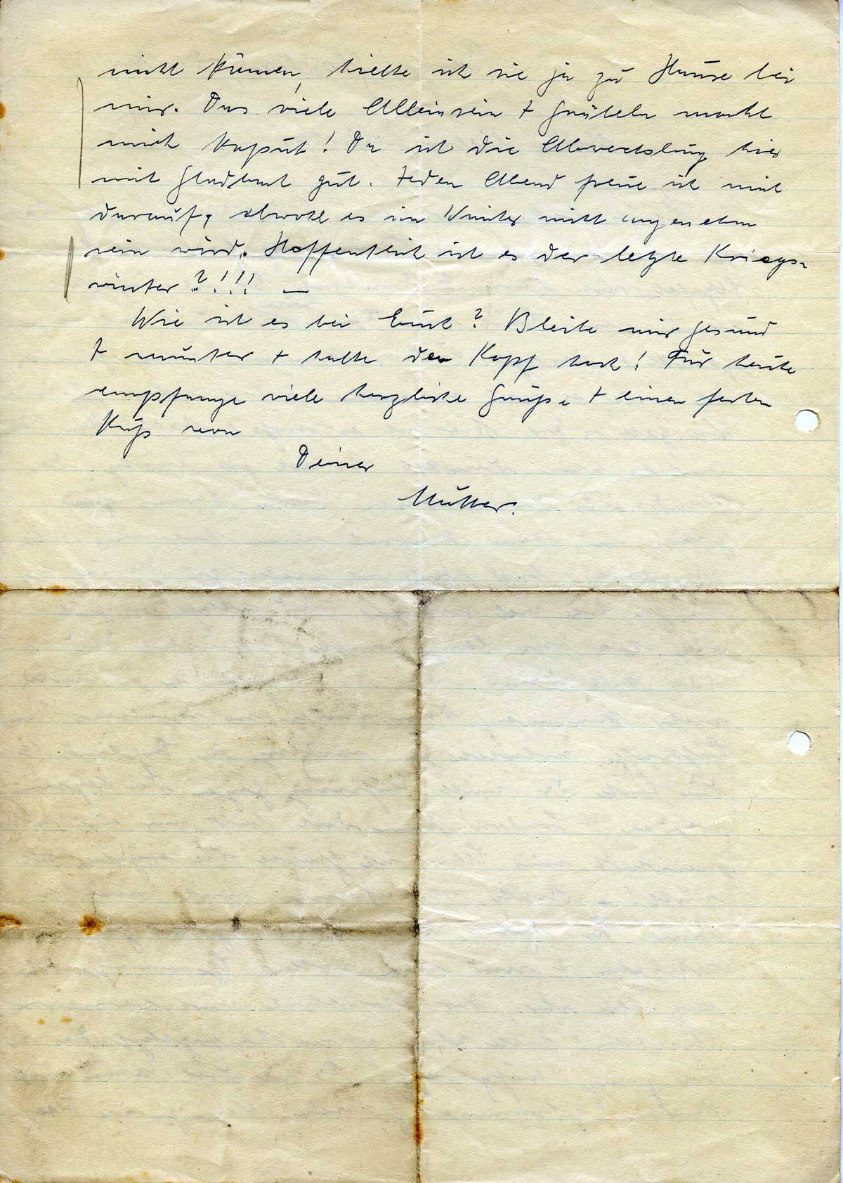 Heute bekam ich ein Päckchen zurück, daß ich an die andere Nummer geschickt hatte. Aepfel waren darin + Bonbons. Es ist ärgerlich, wenn man Euch eine Freude machen will und hat es gepackt + besorgt, und es kommt dann zurück. Ich werde es neu einpacken + Dir wieder zusenden. Wie geht es Dir. Hier ist es naß + kalt! Um 5 Uhr war es schon dunkel. Es ist ja lästig, des Abends aus der warmen Küche heraus zu gehen, und dann kommt man hier ins Kalte. Ich glaube, bald bleibe ich wieder zu Hause. Ich bin ja hier viel ruhiger und schlafe so gut + tief hier, wie lange nicht. Hoffentlich wird es bald kalt, dann sollen die Engländer ja nicht mehr kommen, dann würden sie vereisen. Unsere Luftwaffe arbeitet ja mächtig in England. Ob die Leute da nicht aufsässig gegen die Regierung werden? London kann doch bald nur eine Ruinenstadt sein. Aber ich glaube, die ergeben sich nicht! – Heute war Hanni noch mal bei mir. Sie haben ihre Wunschzettel geschrieben + sind nun voller Spannung. Ich erzählte ihr, der Schreibtisch wäre verschlossen, Christkind hätte schon etwas hineingelegt. Da war sie ganz aufgeregt! Es ist doch schön mit Kindern zusammen zu sein. Wenn ja die Flieger