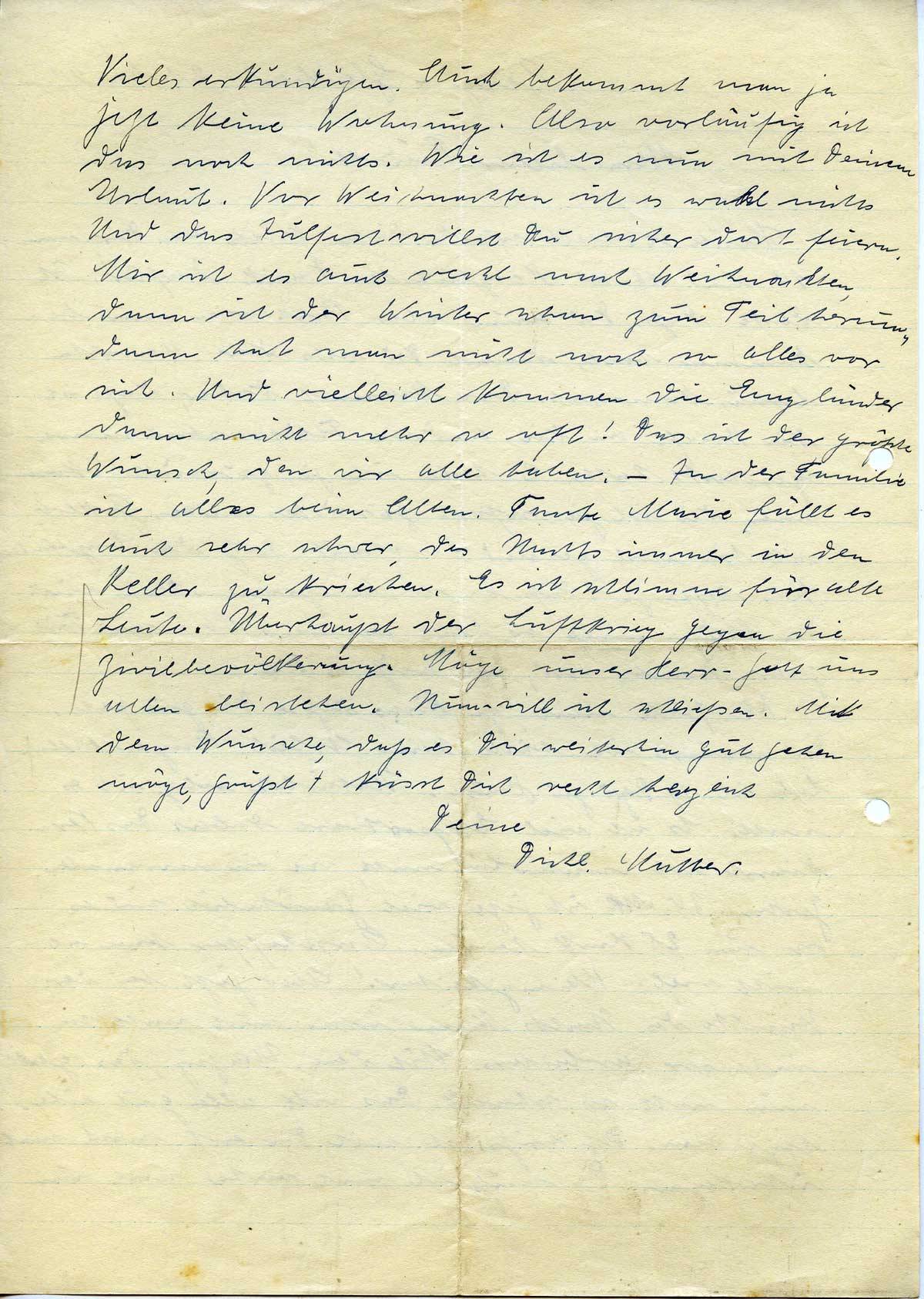 Vieles erkundigen. Auch bekommt man ja jetzt keine Wohnung. Also vorläufig ist das noch nichts. Wie ist es nun mit Deinem Urlaub. Vor Weihnachten ist es wohl nichts. Und das Julfest willst Du sicher dort feiern. Mir ist es auch recht nach Weihnachten, dann ist der Winter schon zum Teil herum, dann hat man nicht noch so alles vor sich. Und vielleicht kommen die Engländer dann nicht mehr so oft! Das ist der größte Wunsch, den wir alle haben. – In der Familie ist alles beim Alten. Tante Marie fällt es auch sehr schwer, des Nachts immer in den Keller zu kriechen. Es ist schlimm für alle Leute. Überhaupt der Luftkrieg gegen die Zivilbevölkerung. Möge unser Herr-Gott uns allen beistehen. Nun will ich schließen. Mit dem Wunsche, daß es Dir weiterhin gut gehen möge, grüßt + küsst Dich recht herzlich