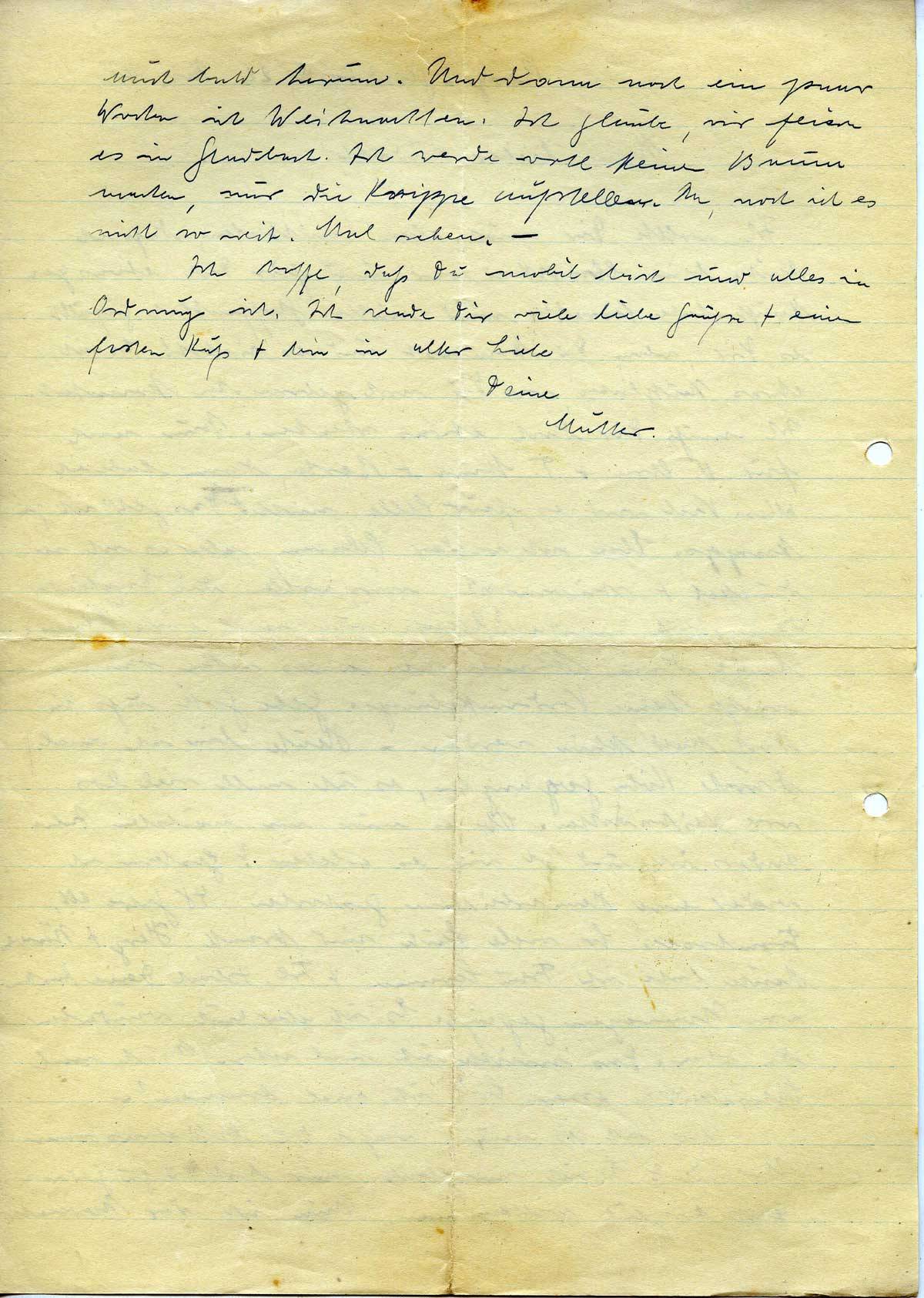 Ich wollte Dir nur eben mitteilen, daß ich heute beim Christkind war und für Dich etwas gekauft habe. Verraten wird nichts. Hoffentlich gefällt es Dir, wenn Du kommst und es siehst! Es ist etwas Nützliches, was Du noch gebrauchen konntest. Ich muß Dir doch etwas schenken. Nun noch für O. Arn. + T. Stina + Berta, dann habe ich alles. Viel wird es für Alle nicht. Das Geld ist ja knapp. Eben ist wieder Alarm, aber es ist so dunkel + stürmisch, was wollen die Engländer denn heute machen? Wenn nur mal erst Schnee liegt, dann können sie alles sehen, dann nützt keine Verdunkelung. Gebe Gott, daß sie doch bald klein werden. – Heute bin ich mal durch Köln gegangen, es ist nicht viel los vor Weihnachten. Ob es nun im nächsten Jahr anders ist und ob wir es erleben? Gestern ist wieder eine Heimarbeiterin gestorben, 48 Jahre alt, Trombose. So viele Leute sind krank, Herz + Nerven. Heute habe ich Frau Severin + Frl. Isbach Deine Karten von Norwegen gezeigt. Es ist aber auch wunderbar da oben. Da möchte ich mal sehen. Auch mal Sahnekuchen essen. Soll ich mal kommen? –