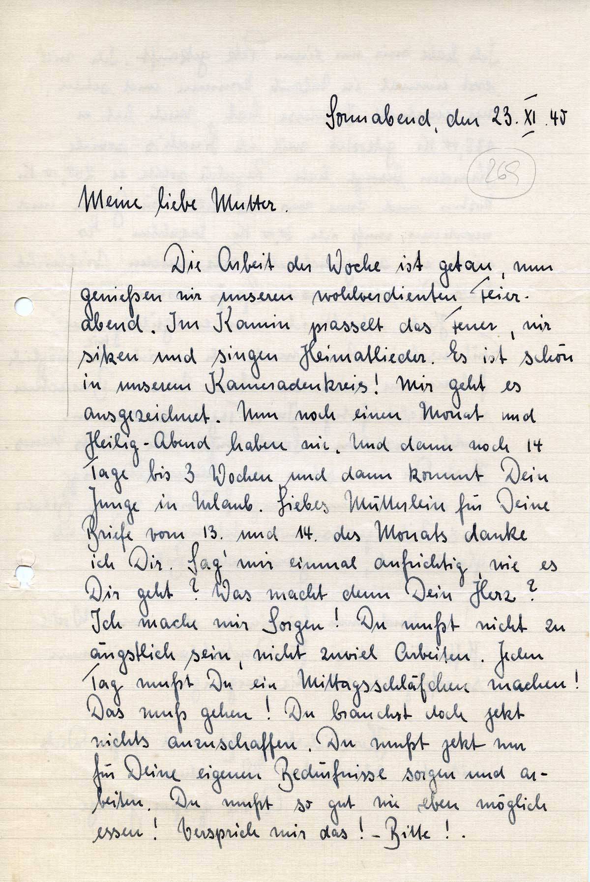 Die Arbeit der Woche ist getan, nun genießen wir unseren wohlverdienten Feierabend. Im Kamin prasselt das Feuer, wir sitzen und singen Heimatlieder. Es ist schön in unserem Kameradenkreis! Mir geht es ausgezeichnet. Nun noch einen Monat und Heilig-Abend haben wir. Und dann noch 14 Tage bis 3 Wochen und dann kommt Dein Junge in Urlaub. Liebes Mütterlein für Deine Briefe vom 13. und 14. des Monats danke ich Dir. Sag‘ mir einmal aufrichtig, wie es Dir geht? Was macht denn Dein Herz? Ich mache mir Sorgen! Du mußt nicht zu ängstlich sein, nicht zuviel arbeiten. Jeden Tag mußt Du ein Mittagsschläfchen machen! Das muß gehen! Du brauchst doch jetzt nichts anzuschaffen. Du mußt jetzt nur für Deine eigenen Bedürfnisse sorgen und arbeiten. Du mußt so gut wie eben möglich essen! Versprich mir das! – Bitte!.