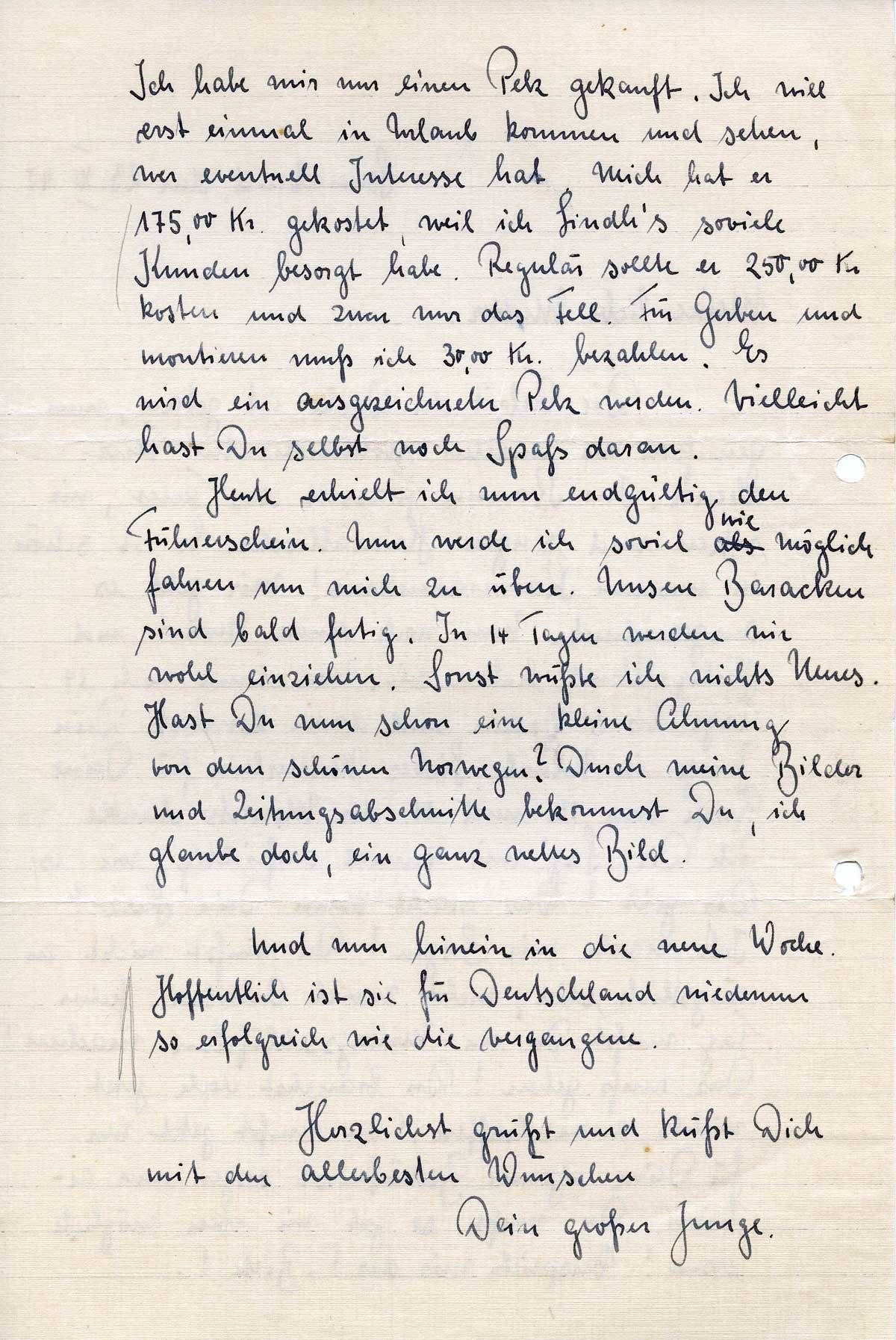 Heute erhielt ich nun endgültig den Führerschein. Nun werde ich soviel wie möglich fahren um mich zu üben. Unsere Baracken sind bald fertig. In 14 Tagen werden wir wohl einziehen. Sonst wüßte ich nichts Neues. Hast Du nun schon eine kleine Ahnung von dem schönen Norwegen? Durch meine Bilder und Zeitungsabschnitte bekommt Du, ich glaube doch, ein ganz nettes Bild.