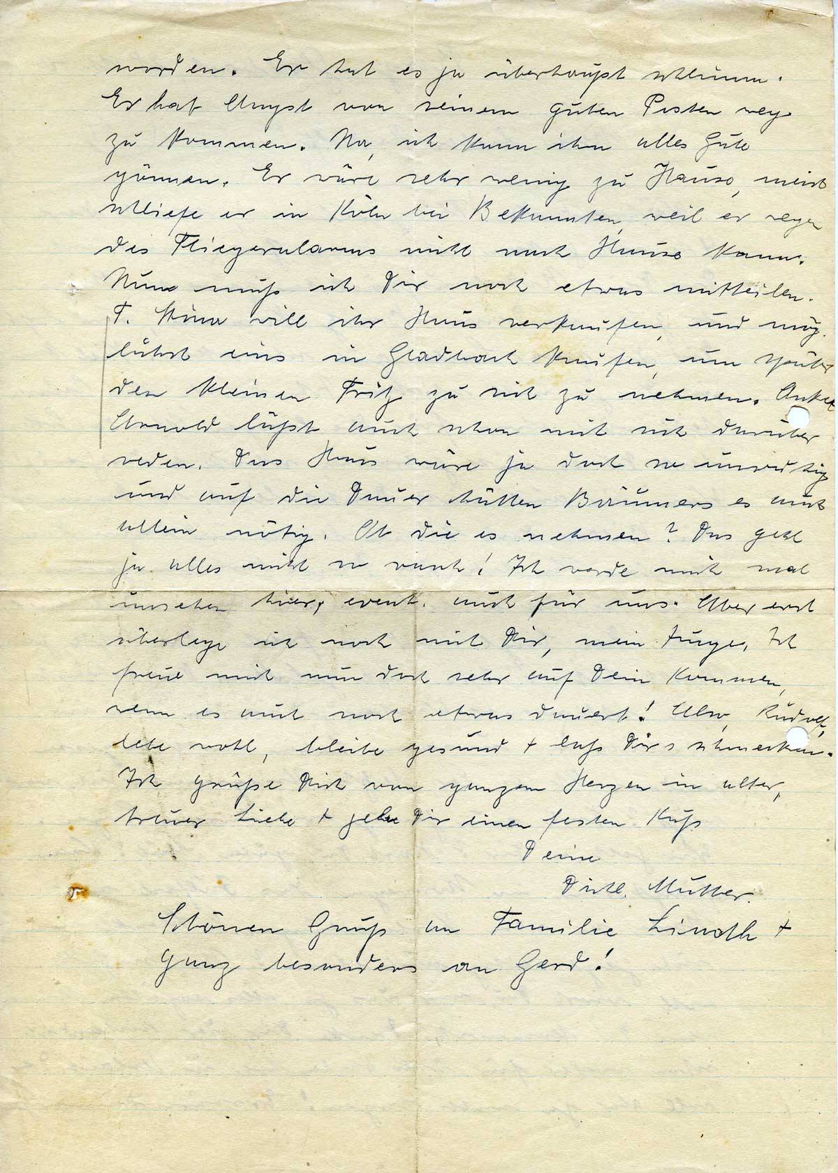 worden. Er hat es ja überhaupt schlimm. Er hat Angst von seinem guten Posten weg zu kommen. Na, ich kann ihn alles Gute gönnen. Er wäre sehr wenig zu Hause, meist schliefe er in Köln bei Bekannten, weil er wegen des Fliegeralarms nicht nach Hause kann. Nun muß ich Dir noch etwas mitteilen. T. Stina will ihr Haus verkaufen, und möglichst eins in Gladbach kaufen, um später den kleinen Fritz zu sich zu nehmen. Onkel Arnold läßt auch schon mit sich darüber reden. Das Haus wäre ja doch so unruhig und auf die Dauer hätten Bäumers es auch allein nötig. Ob die es nehmen? Das geht ja alles nicht so rasch! Ich werde mich mal umsehen hier, event. auch für uns. Aber erst überlege ich noch mit Dir, mein Junge. Ich freue mich nun doch sehr auf Dein Kommen, wenn es auch noch etwas dauert! Also, Rudolf, lebe wohl, bleibe gesund + laß Dir’s schmecken.