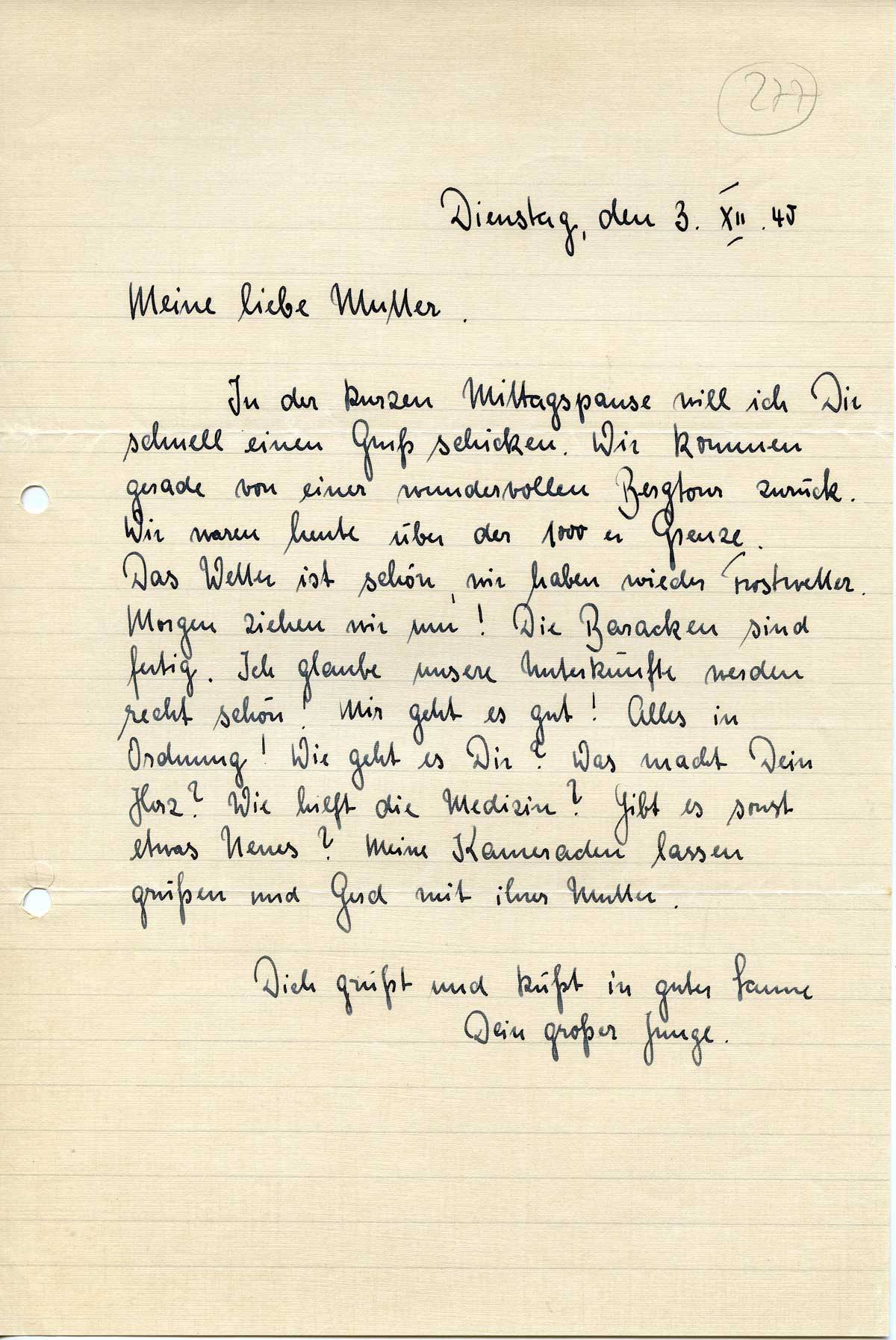 In der kurzen Mittagspause will ich Dir schnell einen Gruß schicken. Wir kommen gerade von einer wundervollen Bergtour zurück. Wir waren heute über der 1000er Grenze. Das Wetter ist schön, wir haben wieder Frostwetter. Morgen ziehen wir um! Die Baracken sind fertig. Ich glaube unsere Unterkünfte werden recht schön! Mir geht es gut! Alles in Ordnung! Wie geht es Dir? Was macht Dein Herz? Wie hilft die Medizin? Gibt es sonst etwas Neues? Meine Kameraden lassen grüßen und Gerd mit ihrer Mutter.