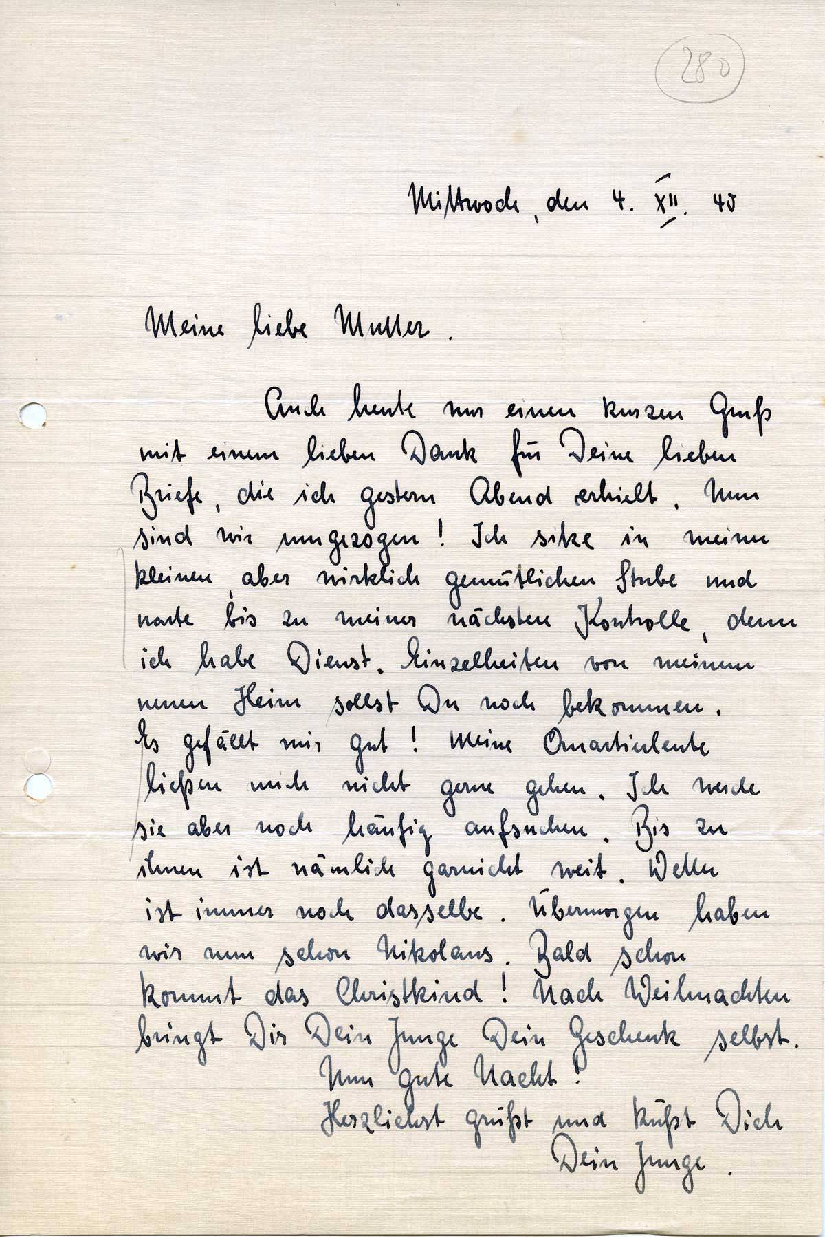Auch heute nur einen kurzen Gruß mit einem lieben Dank für Deine lieben Briefe, die ich gestern Abend erhielt. Nun sind wir umgezogen! Ich sitze in meiner kleinen, aber wirklich gemütlichen Stube und warte bis zu meiner nächsten Kontrolle, denn ich habe Dienst.- Einzelheiten von meinem neuen Heim sollst Du noch bekommen. Es gefällt mir gut! Meine Quartierleute ließen mich nicht gerne gehen. Ich werde sie aber noch häufig aufsuchen. Bis zu ihnen ist nämlich garnicht weit. Wetter ist immer noch dasselbe. Übermorgen haben wir nun schon Nikolaus. Bald schon kommt das Christkind! Nach Weihnachten bringt Dir Dein Junge Dein Geschenk selbst.