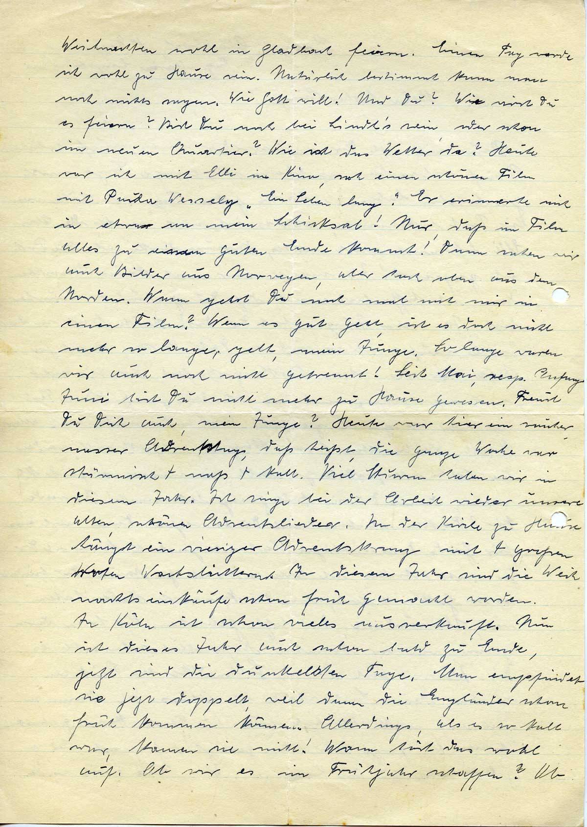 Weihnachten wohl in Gladbach feiern. Einen Tag werde ich wohl zu Hause sein. Natürlich bestimmt kann man noch nichts sagen. Wie Gott will! Und Du? Wie wirst Du es feiern? Bist Du noch bei Lindh’s sein, oder schon im neuen Quartier? Wie ist das Wetter da? Heute war ich mit Elli im Kino, sah einen schönen Film mit Paula Wessely „Ein Leben lang“. Er erinnerte mich in etwa an mein Schicksal! Nur, daß im Film alles zu einem guten Ende kommt! Dann sahen wir auch Bilder aus Norwegen, aber hoch oben aus dem Norden. Wann gehst Du noch mal mit mir in einen Film? Wenn es gut geht, ist es doch nicht mehr so lange, gelt, mein Junge. So lange waren wir auch noch nicht getrennt! Seit Mai, resp. Anfang Juni bist Du nicht mehr zu Hause gewesen. Freust Du Dich auch, mein Junge? Heute war hier ein rauher, nasser Adventstag, daß heißt, die ganze Woche war stürmisch + naß + kalt. Viel Sturm haben wir in diesem Jahr. Ich singe bei der Arbeit wieder unsere alten, schönen Adventslieder. In der Kirche zu Hause hängt ein riesiger Adventskranz mit 4 großen roten Wachslichtern. In diesem Jahr sind die Weihnachtseinkäufe schon früh gemacht worden. In Köln ist schon vieles ausverkauft. Nun ist dieses Jahr auch schon bald zu Ende, jetzt sind die dunkelsten Tage. Man empfindet sie jetzt doppelt, weil dann die Engländer schon früh kommen können. Allerdings, als es so kalt war, konnten sie nicht! Wann hört das wohl auf. Ob wir es im Frühjahr schaffen? Ob