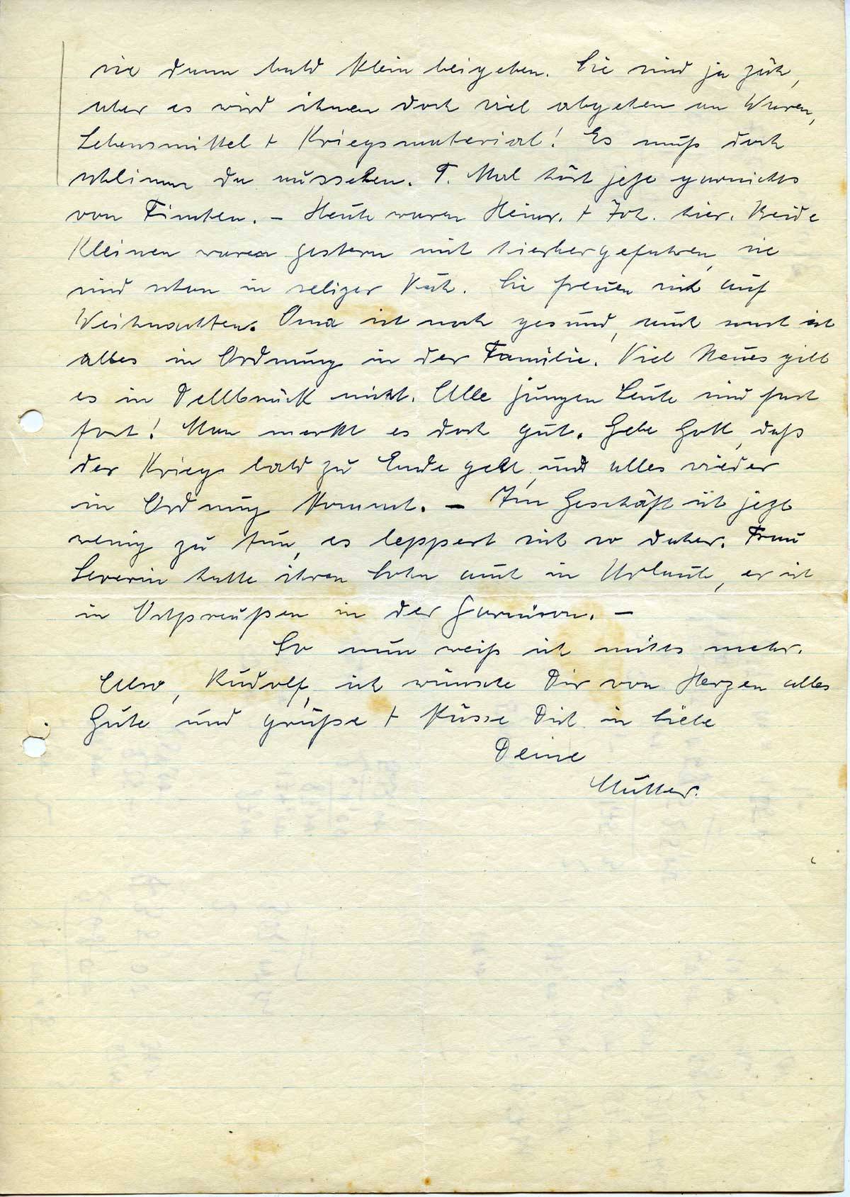 sie dann bald klein beigeben. Sie sind ja zäh, aber es wird ihnen doch viel abgehen an Waren, Lebensmittel + Kriegsmaterial! Es muß doch schlimm da aussehen. T. Mal hört jetzt garnichts von Finchen. – Heute waren Heinr. + Joh. hier. Beide Kleinen waren gestern mit hierhergefahren, sie sind schon in seliger Ruh. Sie freuen sich auf Weihnachten. Oma ist noch gesund, auch sonst ist alles in Ordnung in der Familie. Viel Neues gibt es in Dellbrück nicht. Alle jungen Leute sind fast fort! Man merkt es doch gut. Gebe Gott, daß der Krieg bald zu Ende geht, und alles wieder in Ordnung kommt. – Im Geschäft ist jetzt wenig zu tun, es leppert sich so daher. Frau Severin hatte ihren Sohn auch in Urlaub, er ist in Ostpreußen in der Garnison. –