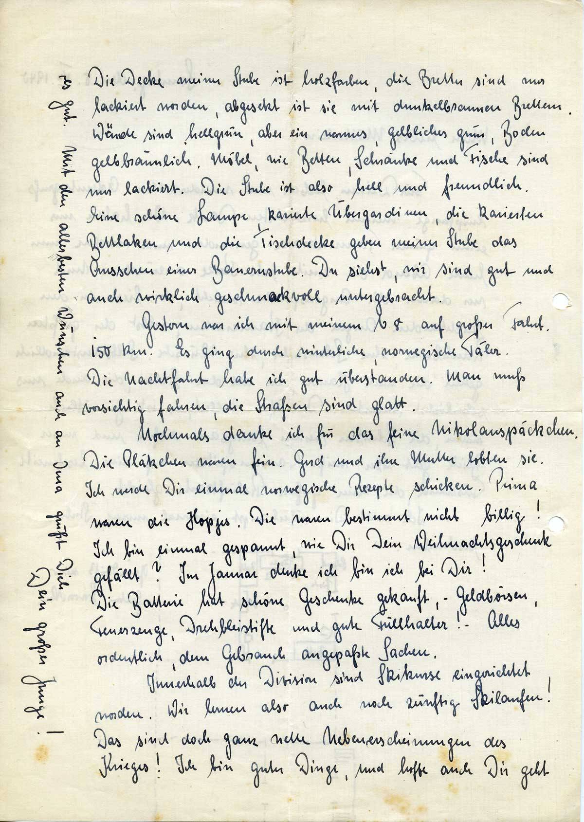 Für Deinen lieben und wundervollen Adventsgruß empfange meinen herzlichsten Dank. Wir haben uns einen grünen Tannenkranz gewunden und werden nun heute Abend die zweite rote Kerze anzünden. Und wer dann die Augensprache versteht, der liest in den leuchtenden Augen der Kameraden, selbst der größten Rauhbeine, ihre Sehnsucht, ihre Wünsche. Selbstverständlich gehen die nach Hause, zu all den Lieben, die auch uns sehnlichst erwarten. Der Ofen bullert, es ist gemütlich warm, die Scheiben werden langsam eisfrei und unser Blick geht über weiße Tannenspitzen auf eine beschneite Felswand, die einer großen Reliefkarte gleicht.