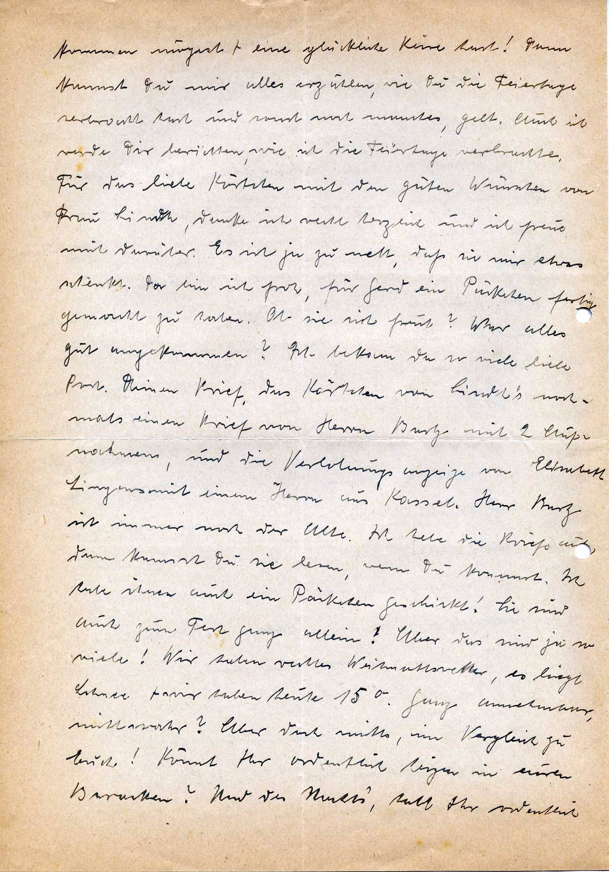 kommen mögest + eine glückliche Reise hast! Dann kannst Du mir alles erzählen, wie Due die Feiertage verbracht hast und sonst noch manches, gelt. Auch ich werde Dir berichten, wie ich die Feiertage verbrachte. Für das liebe Kärtchen mit den guten Wünschen von Frau Lindh, danke ich recht herzlich und ich freue mich darüber. Es ist ja zu nett, daß sie mir etwas schenkt. Da bin ich froh, für Gerd ein Päckchen fertig gemacht zu haben. Ob sie sich freut? War alles gut angekommen? Ich bekam da so viele liebe Post. Deinen Brief, das Kärtchen von Lindh’s nochmals einen Brief von Herrn Bartz mit 2 Aufnahmen, und die Verlobungsanzeige von Elisabeth Lingens mit einem Herrn aus Kassel. Herr Bartz ist immer noch der Alte. Ich hebe die Briefe auf, dann kannst Du sie lesen, wenn Du kommst. Ich habe ihnen auch ein Päckchen geschickt! Sie sind auch zum Fest ganz allein! Aber das sind ja so viele! Wir haben rechtes Weihnachtswetter, es liegt Schnee + wir haben heute 15°. Ganz annehmbar, nicht wahr? Aber doch nichts, im Vergleich zu Euch! Könnt Ihr ordentlich heizen in euren Baracken? Und des Nachts, habt Ihr ordentlich