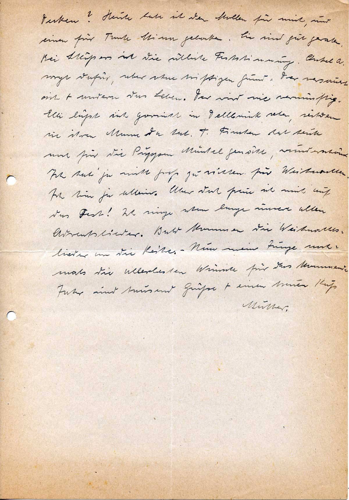 Decken? Heute habe ich den Stollen für mich, und einen für Tante Stina gebacken. Sie sind gut geraten. Bei Schlößers ist die übliche Feststimmung. Onkel A. sorgt dafür, aber ohne triftigen Grund. Der versauert sich + andern das Leben. Der wird nie vernünftig. Elli läßt sich garnicht in Dellbrück sehen, seitdem sie ihren Mann da hat. T. Finchen hat heute mal für die Puppen Mäntel genäht, wunderschön. Ich hab‘ ja nicht groß zu richten für Weihnachten. Ich bin ja allein. Aber doch freue ich mich auf das Fest! Ich singe schon lange unsere alten Adventslieder. Bald kommen die Weihnachtslieder an die Reihe. – Nun mein Junge nochmals die allerbesten Wünsche für das kommende Jahr und tausend Grüße + einen treuen Kuß