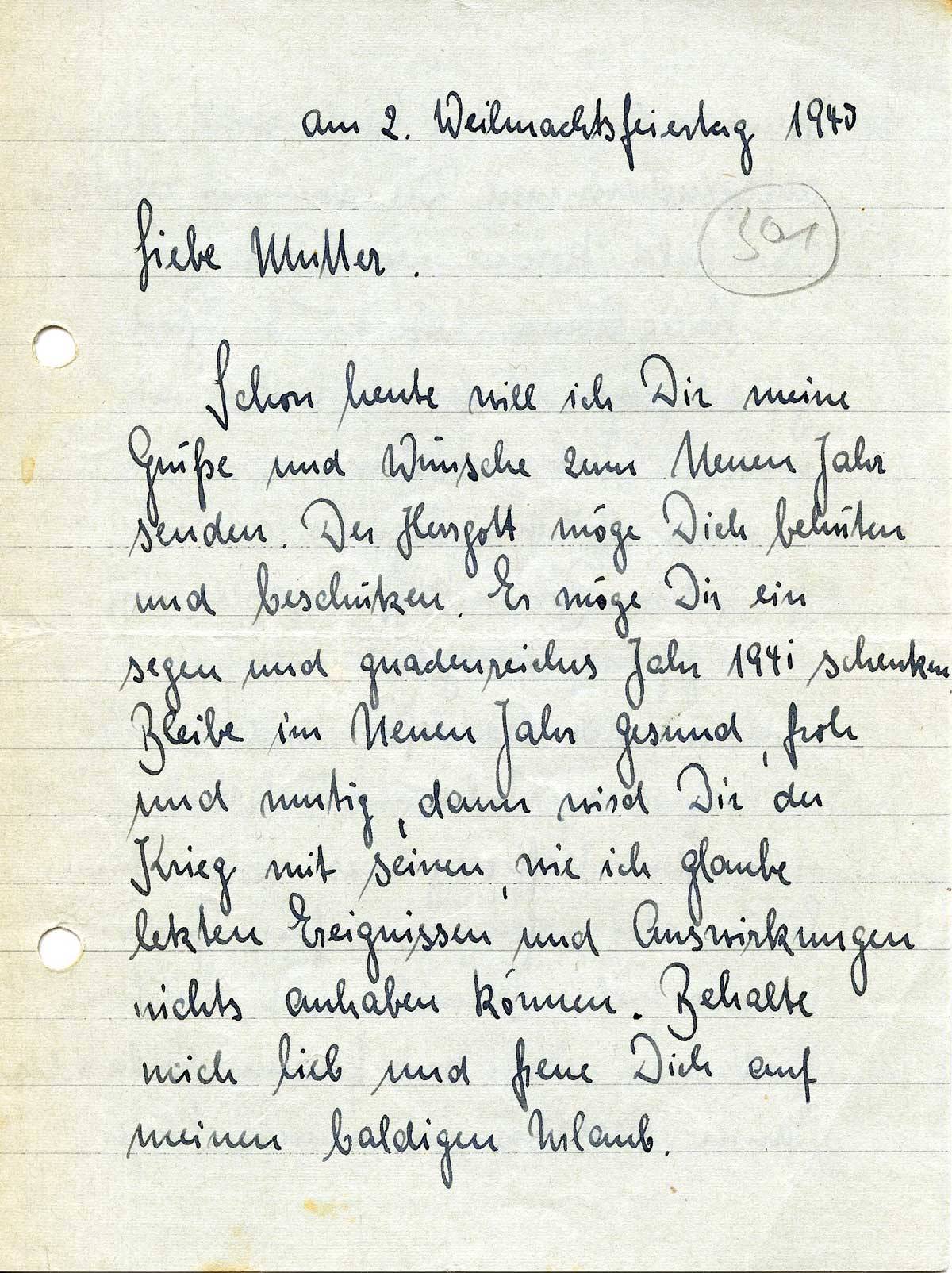 Schon heute will ich Dir meine Grüße und Wünsche zum Neuen Jahr senden. Der Herrgott möge Dich behüten und beschützen. Er möge Dir ein segen und gnadenreiches Jahr 1941 schenken. Bleibe im Neuen Jahr gesund, froh und mutig, dann wird Dir der Krieg mit seinen, wie ich glaube letzten Ereignissen und Auswirkungen nichts anhaben können. Behalte mich lieb und freue Dich auf meinen baldigen Urlaub.