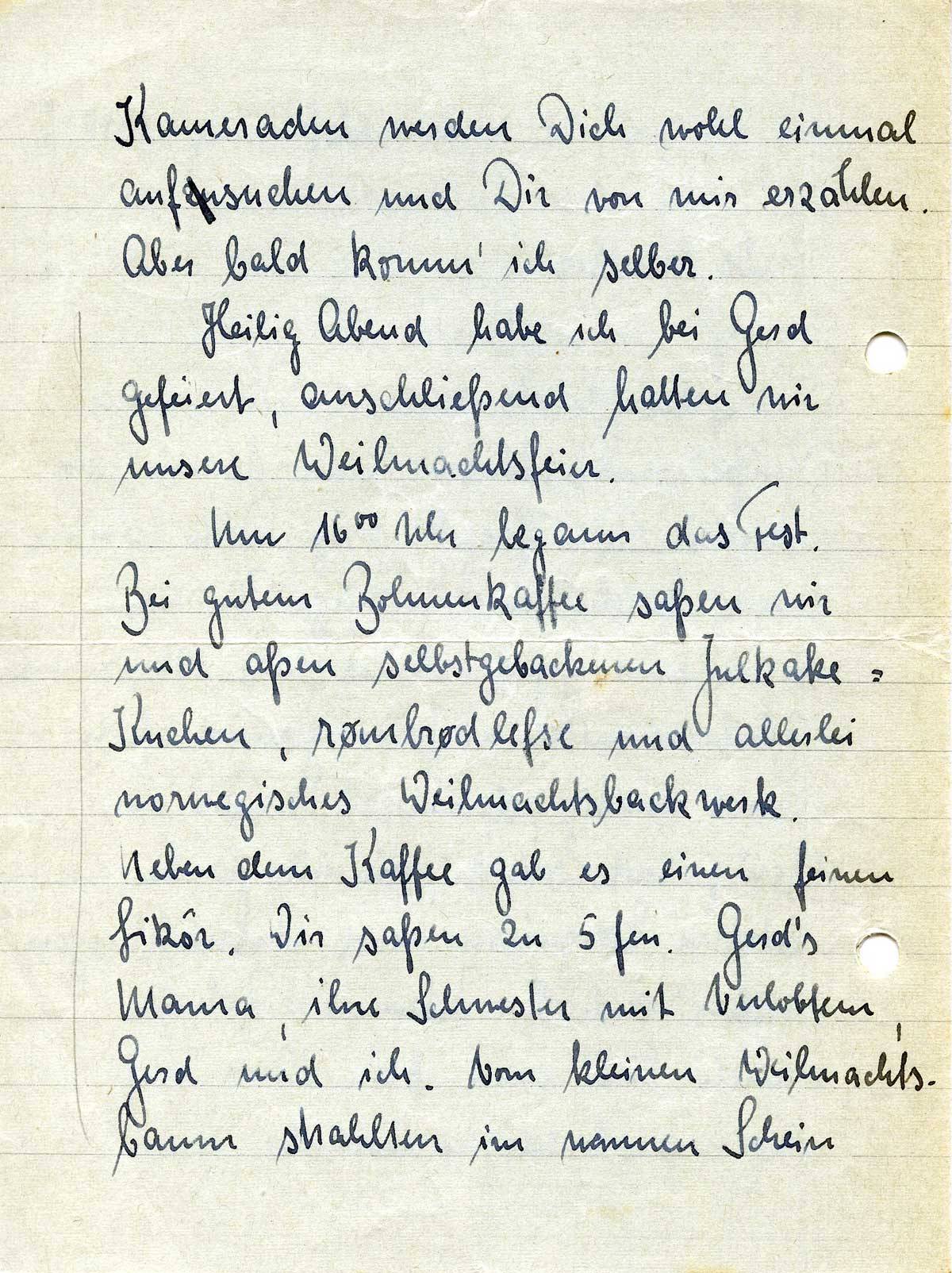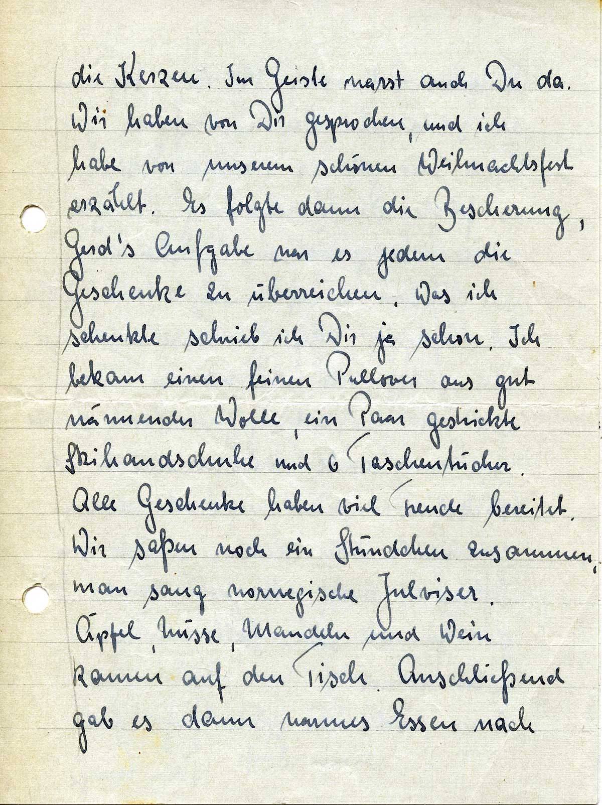 die Kerzen. Im Geiste warst auch Du da. Wir haben von Dir gesprochen, und ich habe von unserem schönen Weihnachtsfest erzählt. Es folgte dann die Bescherung, Gerd’s Aufgabe war es jedem die Geschenke zu überreichen. Was ich schenkte schrieb ich Dir ja schon. Ich bekam einen feinen Pullover aus gut wärmender Wolle, ein Paar gestrickte Skihandschuhe und 6 Taschentücher. Alle Geschenke haben viel Freude bereitet. Wir saßen noch ein Stündchen zusammen, man sang norwegische Julviser. Äpfel, Nüsse, Mandeln und Wein kamen auf den Tisch. Anschließend gab es dann warmes Essen nach