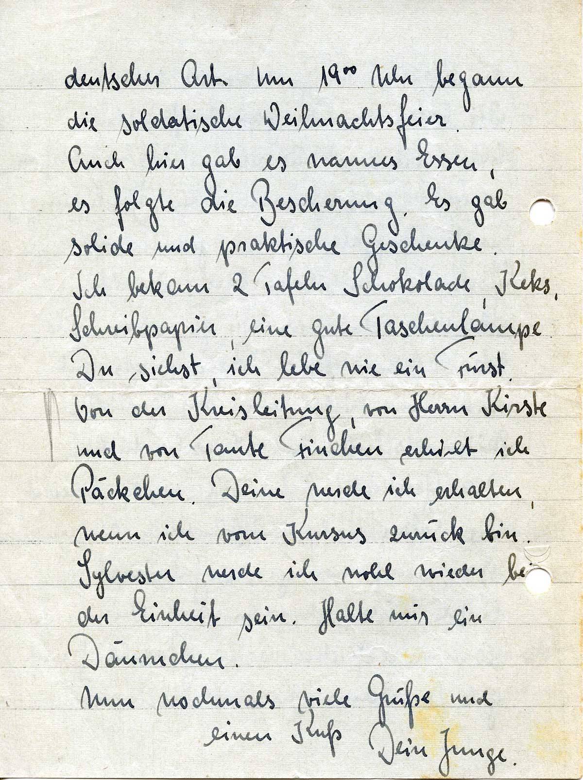 deutscher Art. Um 19.00 Uhr begann die soldatische Weihnachtsfeier. Auch hier gab es warmes Essen, es folgte die Bescherung. Es gab solide und praktische Geschenke. Ich bekam 2 Tafeln Schokolade, Keks, Schreibpapier, eine gute Taschenlampe. Du siehst, ich lebe wie ein Fürst. Von der Kreisleitung, von Herrn Kirste und von Tante Finchen erhielt ich Päckchen. Deine werde ich erhalten, wenn ich vom Kursus zurück bin. Sylvester werde ich wohl wieder bei der Einheit sein. Halte mir ein Däumchen.