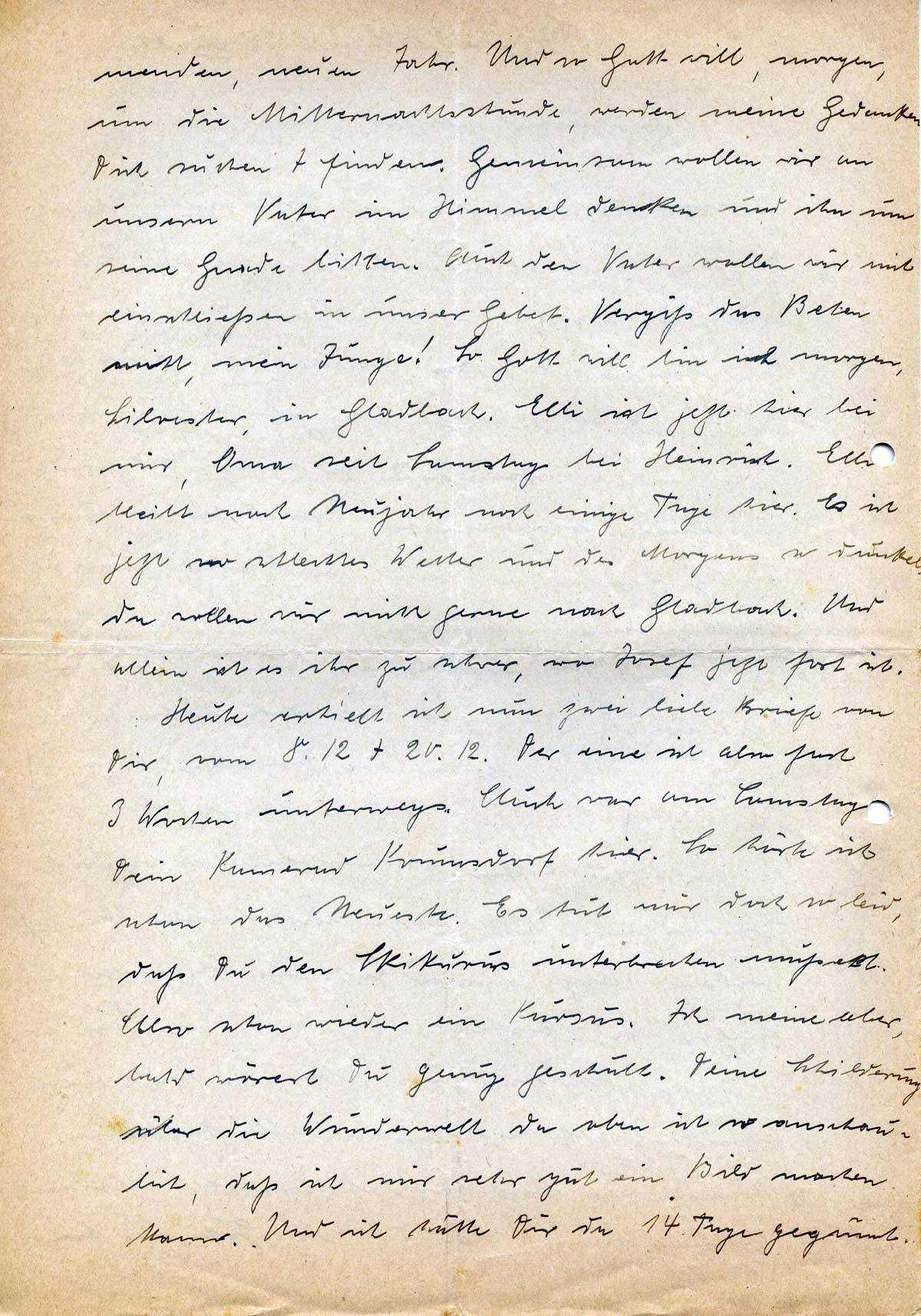 menden, neuen Jahr. Und so Gott will, morgen, um die Mitternachtsstunde, werden meine Gedanken Dich suchen + finden. Gemeinsam wollen wir an unsern Vater im Himmel denken und ihn um seine Gnade bitten. Auch den Vater wollen wir mit einschließen in unser Gebet. Vergiß das Beten nicht, mein Junge! So Gott will bin ich morgen, Silvester, in Gladbach. Elli ist jetzt hier bei mir, Oma seit Samstag bei Heinrich. Elli bleibt nach Neujahr noch einige Tage hier. Es ist jetzt so schlechtes Wetter und des Morgens so dunkel, da wollen wir nicht gerne nach Gladbach. Und allein ist es ihr zu schwer, wo Josef jetzt fort ist.
