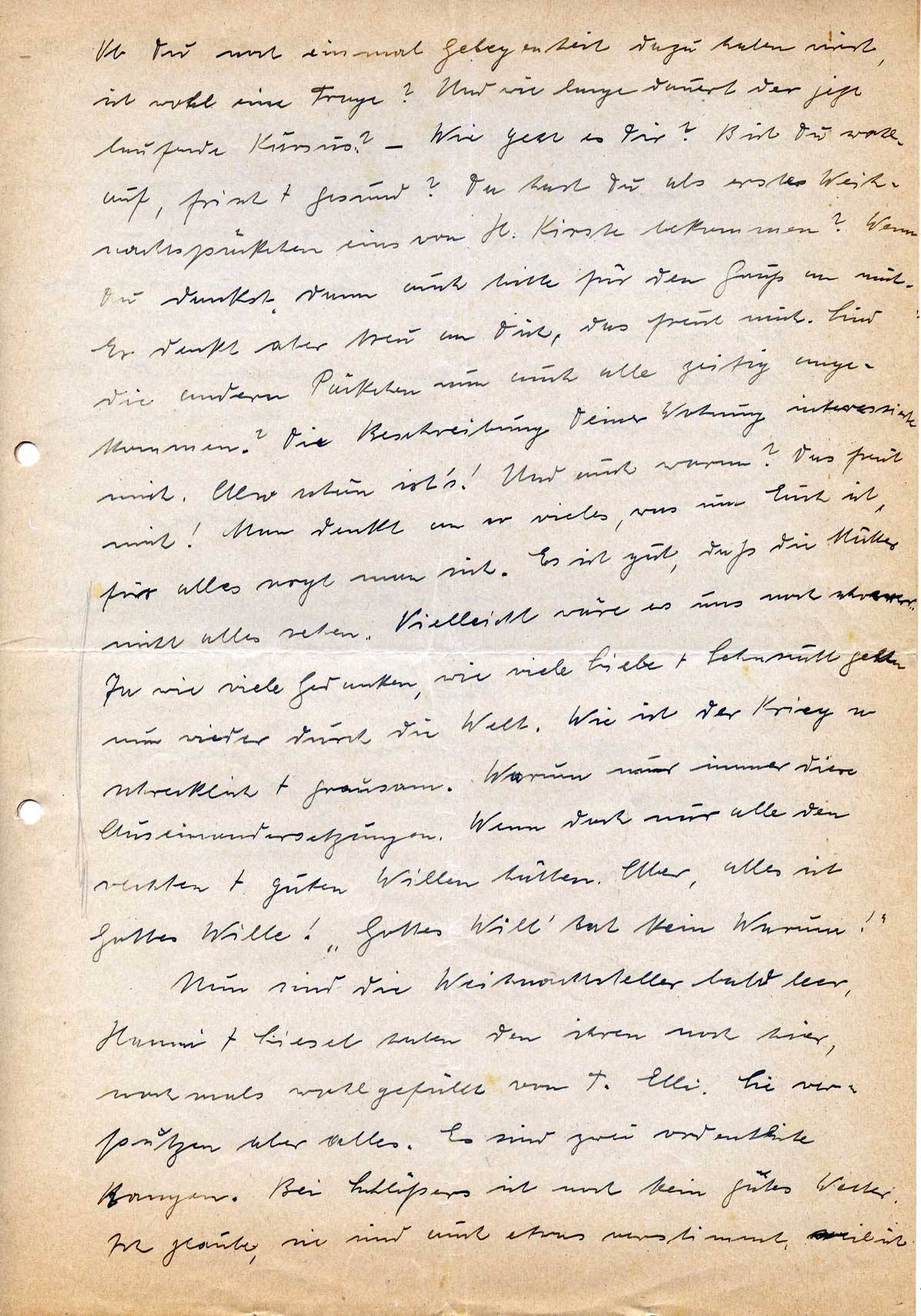 Ob Du noch einmal Gelegenheit dazu haben wirst, ist wohl eine Frage? Und wie lange dauert der jetzt laufende Kursus? – Wie geht es Dir? Bist Du wohlauf, frisch + gesund? Da hast Du als erstes Weihnachtspäckchen eins von H. Kirste bekommen? Wenn Du dankst, dann auch bitte für den Gruß an mich. Er denkt aber treu an Dich, das freut mich. Sind die andern Päckchen nun auch alle zeitig angekommen? Die Beschreibung Deiner Wohnung interessierte mich. Also schön ist’s! Und auch warm? Das freut mich! Man denkt an so vieles, was um Euch ist, für alles sorgt man sich. Es ist gut, daß die Mütter nicht alles sehen. Vielleicht wäre es uns noch schwerer. Ja wie viele Gedanken, wie viele Liebe + Sehnsucht gehen nun wieder durch die Welt. Wie ist der Krieg so schrecklich + grausam. Warum nur immer diese Auseinandersetzungen. Wenn doch nur alle den rechten + guten Willen hätten. Aber, alles ist Gottes Wille! „Gottes Will‘ hat kein Warum!“