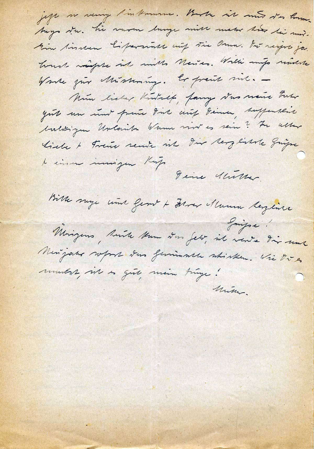 Bevor das alte Jahr zu Ende geht, will ich Dir noch einmal ausführlich schreiben. Ist es möglich, daß schon wieder ein Jahr herum ist? Im vorigen Jahr, an diesem Tage, warst Du zu Hause, und wir hofften damals bestimmt, dieses Jahr wieder beisammen zu sein. Und gerade in diesem vergangenen Jahr haben wir uns so wenig gesehen, wie noch in keinem zuvor. Ich hatte heute aber noch mal richtige Sehnsucht nach Dir. Und so sehr ich mich ja auf ein Wiedersehen freue, so steht doch dahinter schon wieder der Gedanke an die Trennung. Ob uns das neue Jahr den Frieden bringt? Man wagt es nicht zu hoffen, so sehr man es wünscht. Es wird noch ein langer und harter Kampf werden. Möge unser Gott im Himmel uns helfen und beistehen, daß wir den Sieg erringen. Und für uns wollen wir Kraft + Gesundheit erbitten, daß wir alles das tragen können, was uns noch bevorsteht! Also noch einmal wünsche ich Dir alles Gute im kom-