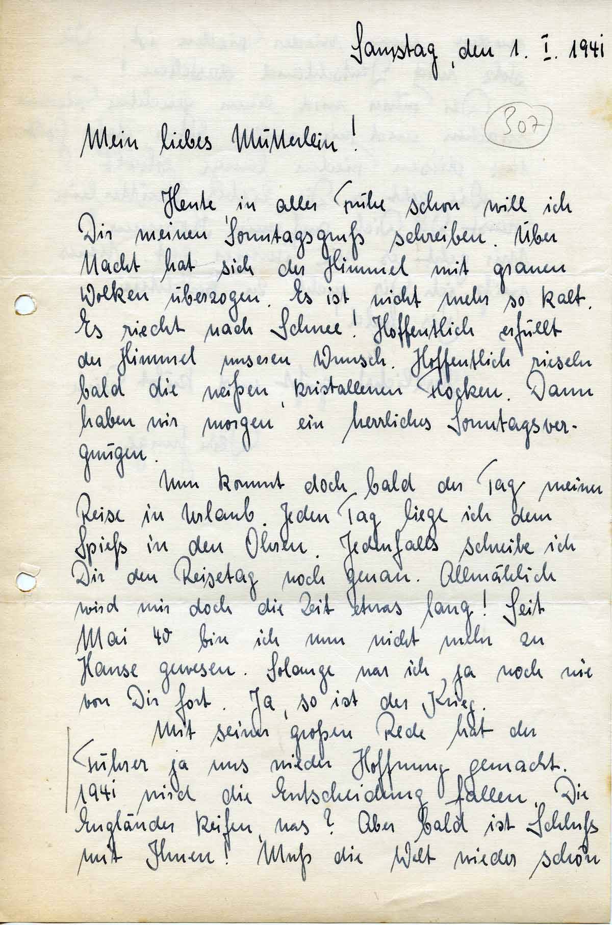 Nun kommt doch bald der Tag meiner Reise in Urlaub. Jeden Tag liege ich dem Spieß in den Ohren. Jedenfalls schreibe ich Dir den Reisetag noch genau. Allmählich wird mir doch die Zeit etwas lang! Seit Mai 40 bin ich nun nicht mehr zu Hause gewesen. Solange war ich ja noch nie von Dir fort. Ja, so ist der Krieg.