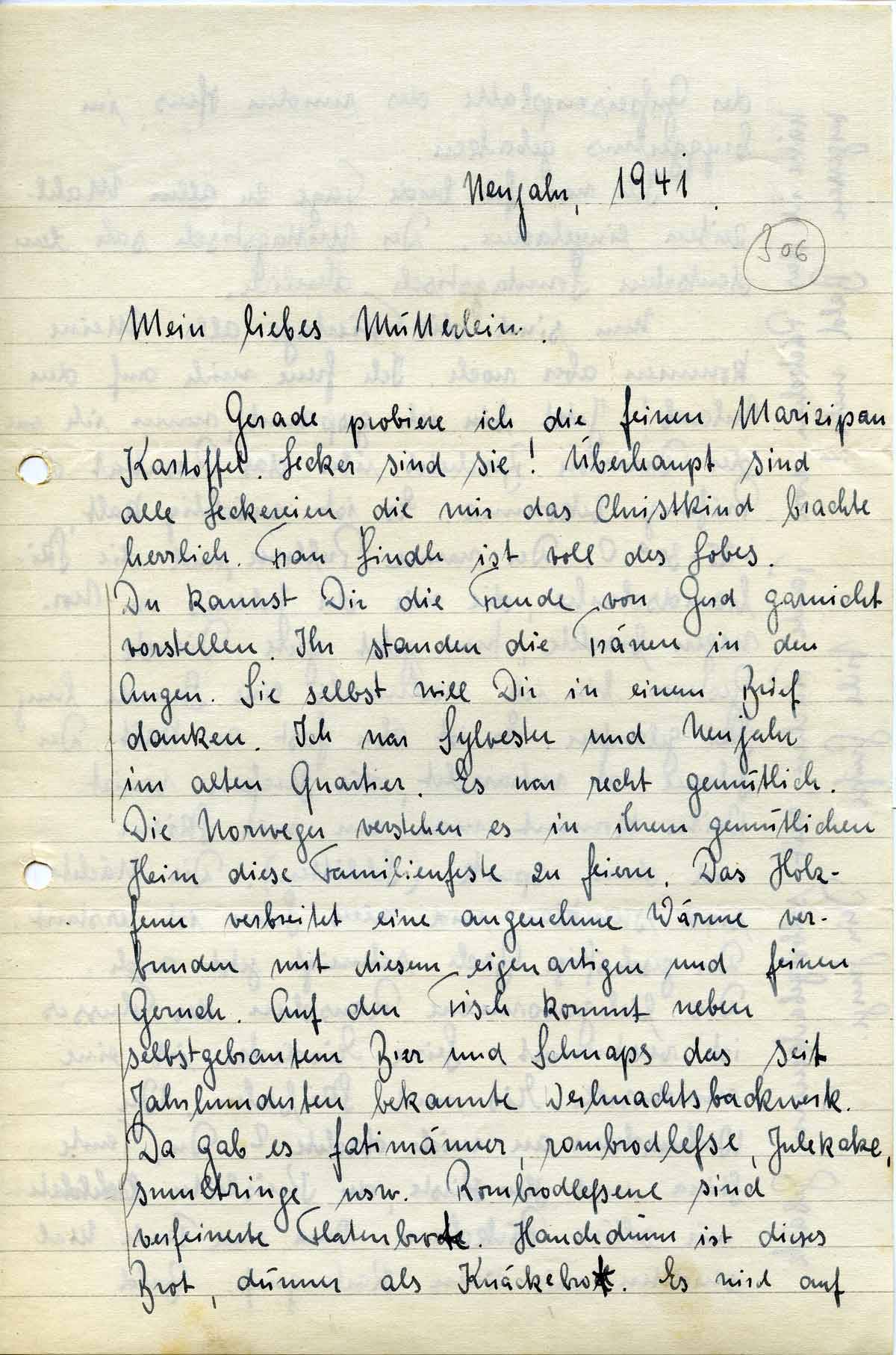 Gerade probiere ich die feinen Marzipan Kartoffel. Lecker sind sie! Überhaupt sind alle Leckereien, die mir das Christkind brachte herrlich. Frau Lindh ist voll des Lobes. Du kannst Dir die Freude von Gerd garnicht vorstellen. Ihr standen die Tränen in den Augen. Sie selbst will Dir in einem Brief danken. Ich war Sylvester und Neujahr im alten Quartier. Es war recht gemütlich. Die Norweger verstehen es in ihrem gemütlichen Heim diese Familienfeste zu feiern. Das Holzfeuer verbreitet eine angenehme Wärme verbunden mit diesem eigenartigen und feinen Geruch. Auf den Tisch kommt neben selbstgebrauten Bier und Schnaps das seit Jahrhunderten bekannte Weihnachtsbackwerk. Da gab es fatimänner, rombrodlefse, Julekake, smultringe usw. Rombrodlefsene sind verfeinerte Flatenbrote. Hauchdünn ist dieses Brot, dünner als Knäckebrot. Es wird auf