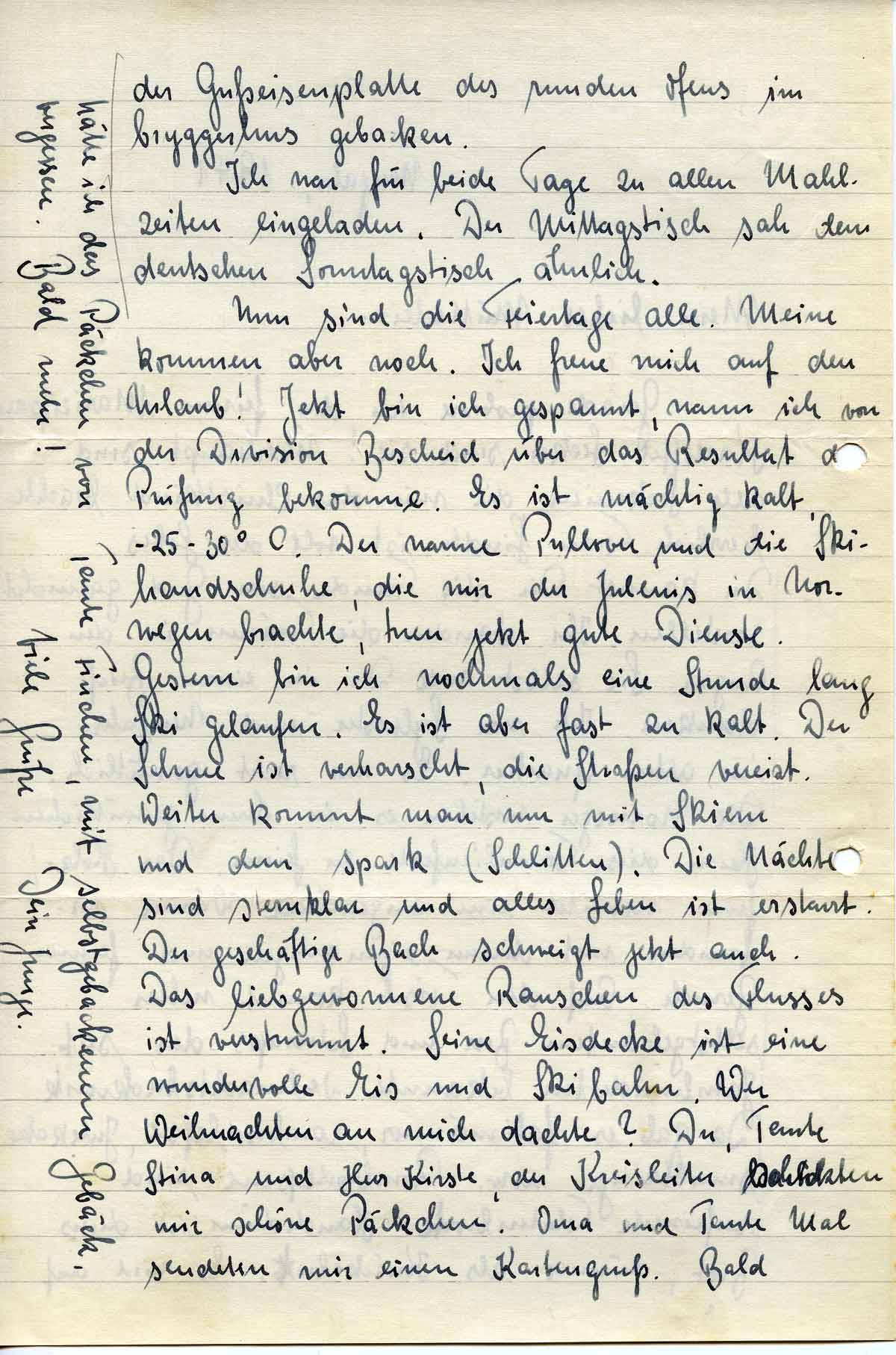Gestern bin ich nochmals eine Stunde lang Ski gelaufen. Es ist aber fast zu kalt. Der Schnee ist verharscht, die Straßen vereist. Weiter kommt man nur mit Skiern und dem spark (Schlitten). Die Nächte sind sternklar und alles Leben ist erstarrt. Der geschäftige Bach schweigt jetzt auch. Das liebgewonnene Rauschen des Flusses ist verstummt. Seine Eisdecke ist eine wundervolle Eis und Skibahn. Wer Weihnachten an mich dachte? Du, Tante Stina und Herr Kirste, der Kreisleiter schickten mir schöne Päckchen. Oma und Tante Mal sendeten mir einen Kartengruß. Bald