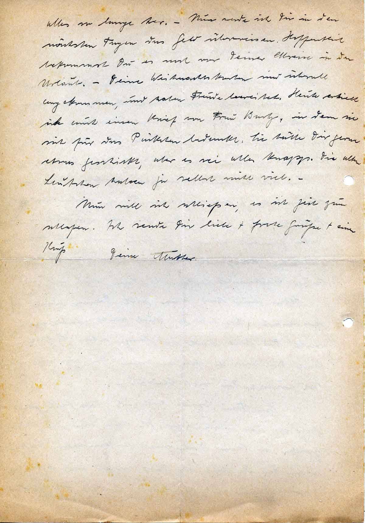 Hier ist es nach einigen milden, aber sehr stürmischen + regnerischen Tagen wieder ordentlich kalt geworden. (10°). Der Winter ist auch in diesem Jahr ziemlich streng. Ich freue mich nun auf den nächsten Brief von Dir, der mir den Verlauf Eures Weihnachtsfestes schildern wird. –