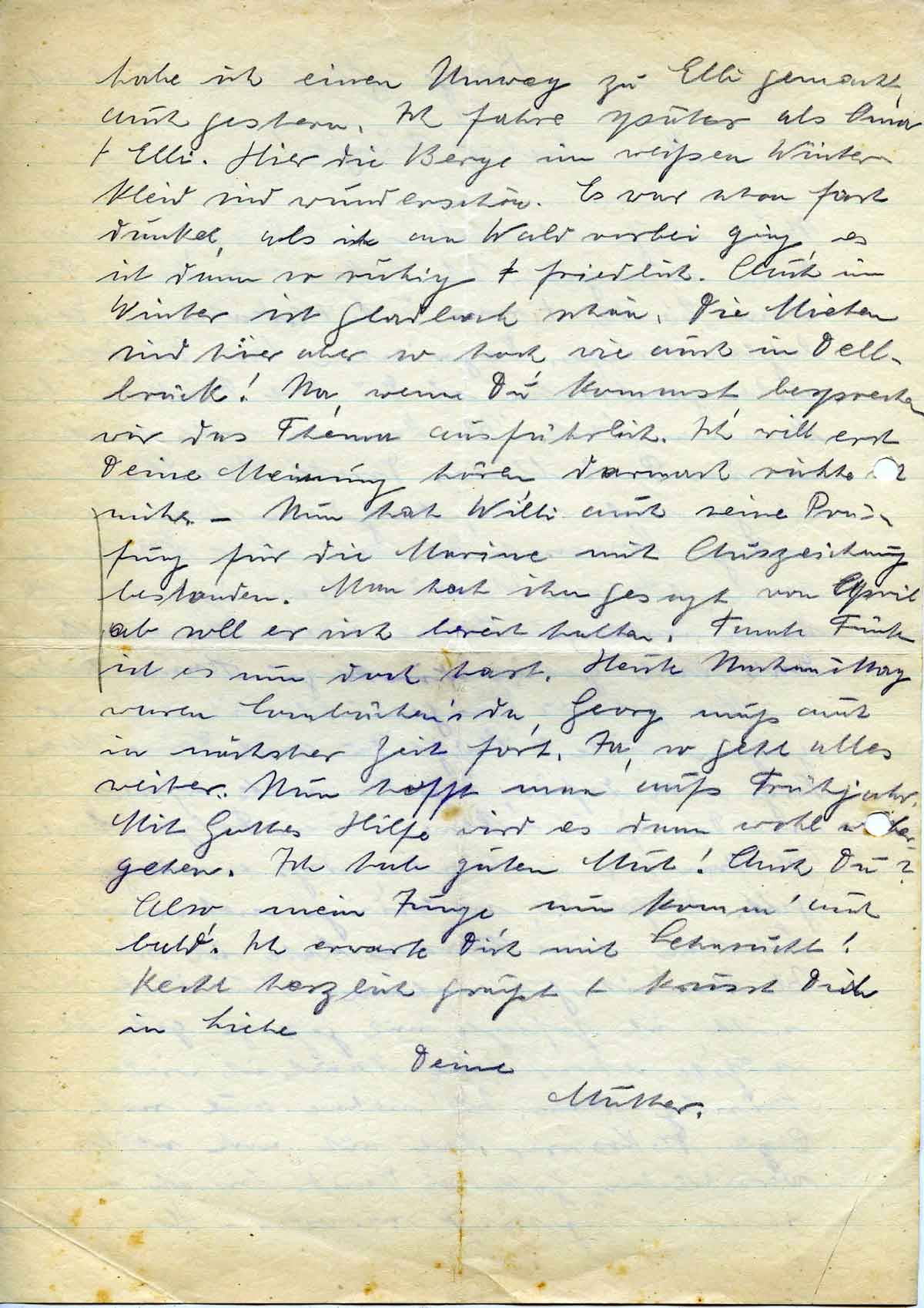 habe ich einen Umweg zu Elli gemacht, auch gestern. Ich fahre später als Oma + Elli. Hier die Berge im weißen Winterkleid sind wunderschön. Es war schon fast dunkel, als ich am Wald vorbei ging, es ist dann so ruhig + friedlich. Auch im Winter ist Gladbach schön. Die Mieten sind hier aber so hoch, wie auch in Dellbrück! Na, wenn Du kommst, besprechen wir das Thema ausführlich. Ich will erst Deine Meinung hören, darnach richte ich mich. – Nun hat Willi auch seine Prüfung für die Marine mit Auszeichnung bestanden. Man hat ihm gesagt, von April ab soll er sich bereit halten. Tante Finchen ist es nun doch hart. Heute Nachmittag waren Combüchen’s da, Georg muß auch in nächster Zeit fort. Ja, so geht alles weiter. Nun hofft man aufs Frühjahr. Mit Gottes Hilfe wird es dann wohl weitergehen. Ich hab guten Mut! Auch Du? Also, mein Junge, nun komm‘ auch bald. Ich erwarte Dich mit Sehnsucht!