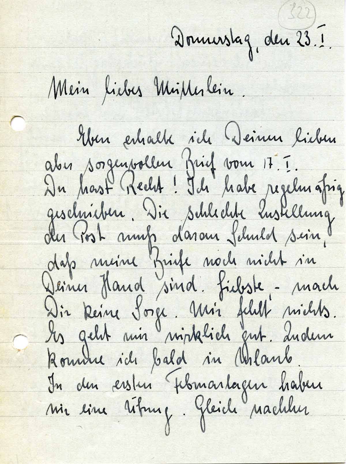 Eben erhalte ich Deinen lieben aber sorgenvollen Brief vom 17.I. Du hast Recht! Ich habe regelmäßig geschrieben. Die schlechte Zustellung der Post muß daran Schuld sein, daß meine Briefe noch nicht in Deiner Hand sind. Liebste, - mach Dir keine Sorge. Mir fehlt nichts. Es geht mir wirklich gut. Zudem komme ich bald in Urlaub. In den ersten Februartagen haben wir eine Übung. Gleich nachher