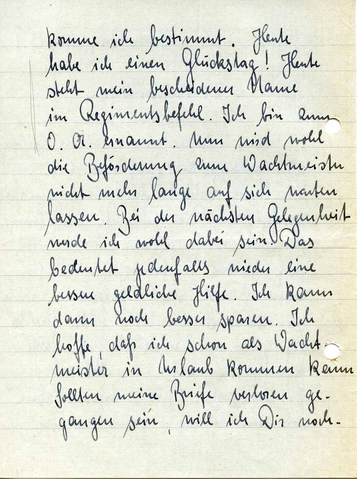 komme ich bestimmt. Heute habe ich einen Glückstag! Heute steht mein bescheidener Name im Regimentsbefehl. Ich bin zum O.A. ernannt. Nun wird wohl die Beförderung zum Wachtmeister nicht mehr lange auf sich warten lassen. Bei der nächsten Gelegenheit werde ich wohl dabei sein. Das bedeutet jedenfalls wieder eine bessere geldliche Hilfe. Ich kann dann noch besser sparen. Ich hoffe, daß ich schon als Wachtmeister in Urlaub kommen kann. Sollten meine Briefe verloren gegangen sein, will ich Dir noch-