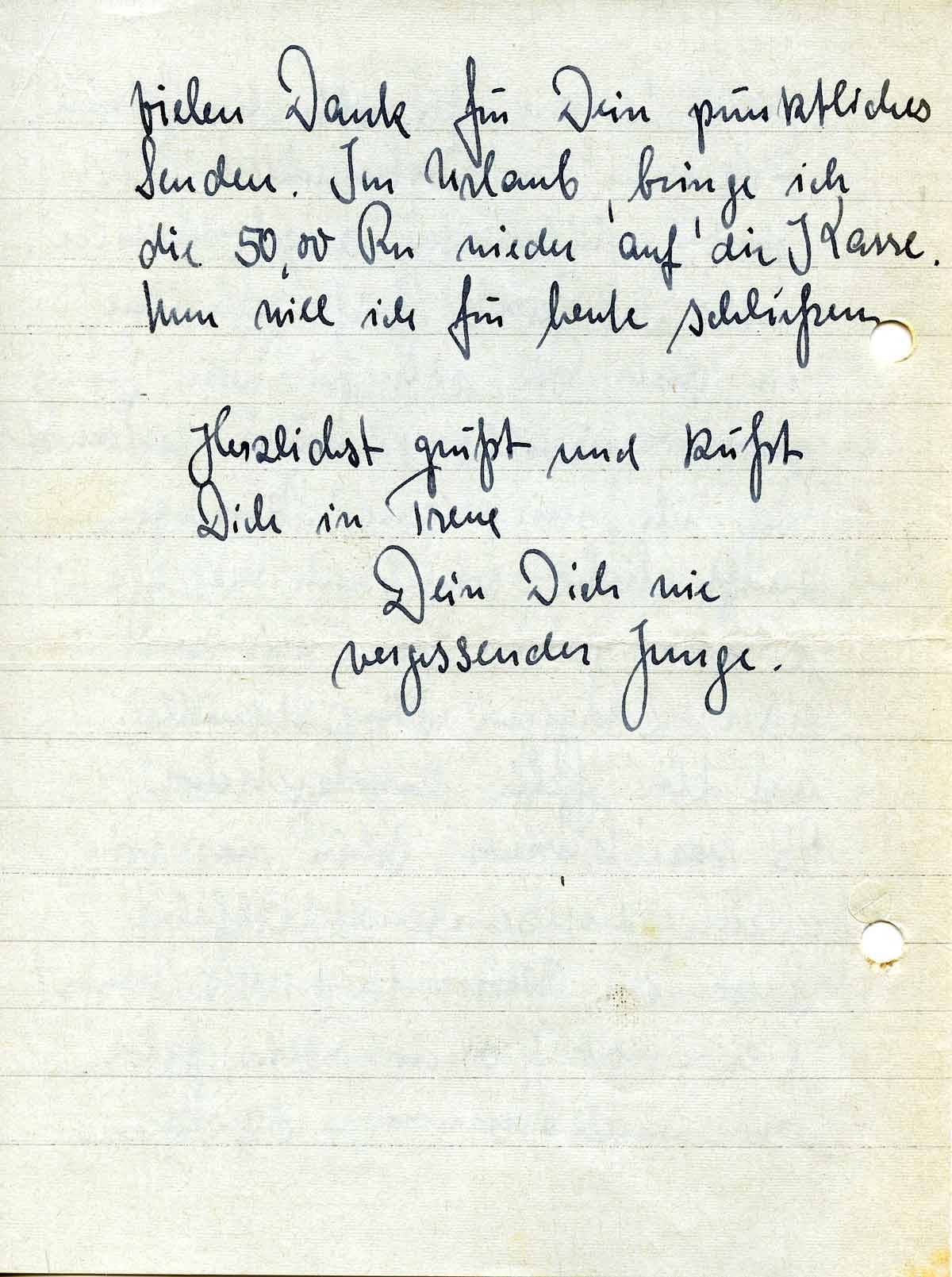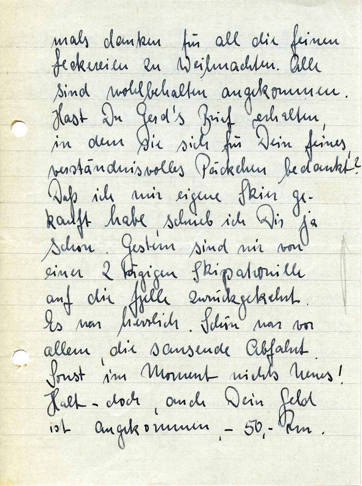 mals danken für all die feinen Leckereien zu Weihnachten. Alle sind wohlbehalten angekommen. Hast Du Gerd’s Brief erhalten, in dem sie sich für Dein feines, verständnisvolles Päckchen bedankt? Daß ich mir eigen Skier gekauft habe, schrieb ich Dir ja schon. Gestern sind wir von einer 2 tätigen Skipatrouille auf die Fjelle zurückgekehrt. Es war herrlich. Schön war vor allem, die sausende Abfahrt. Sonst im Moment nichts Neues! Halt – doch, auch Dein Geld ist angekommen, - 50,- Rm.
