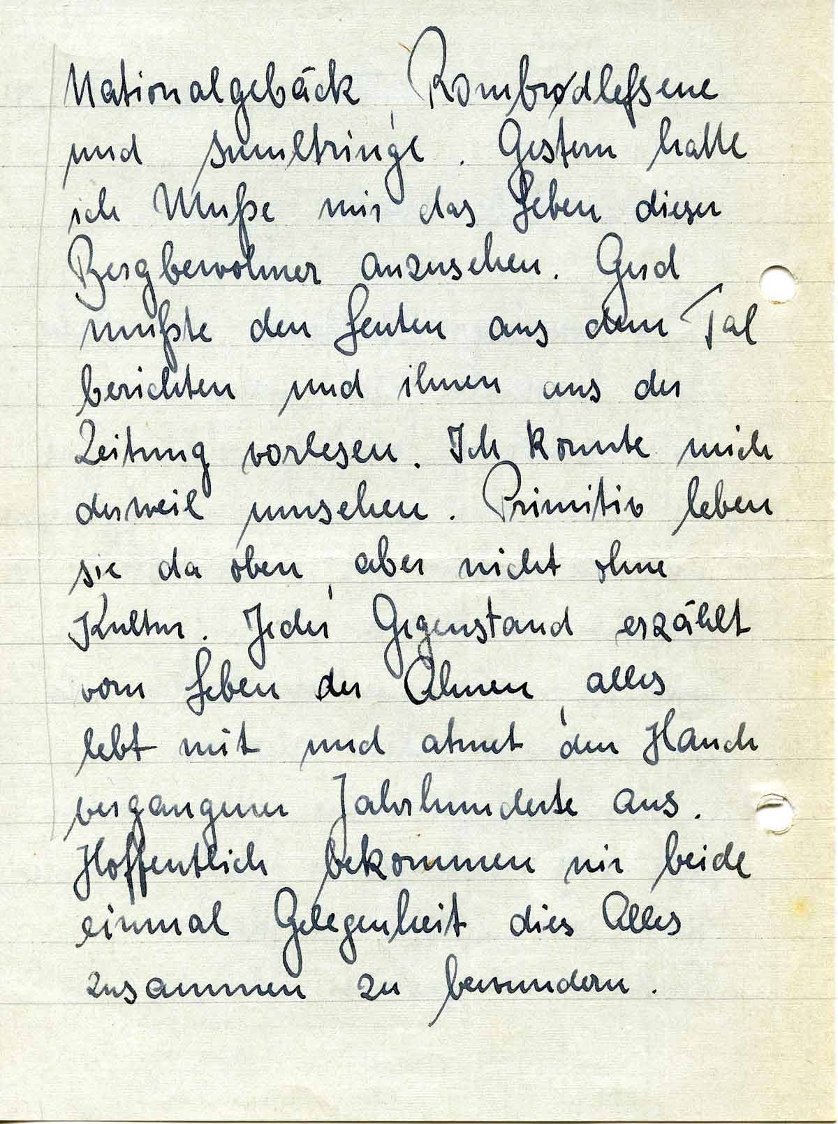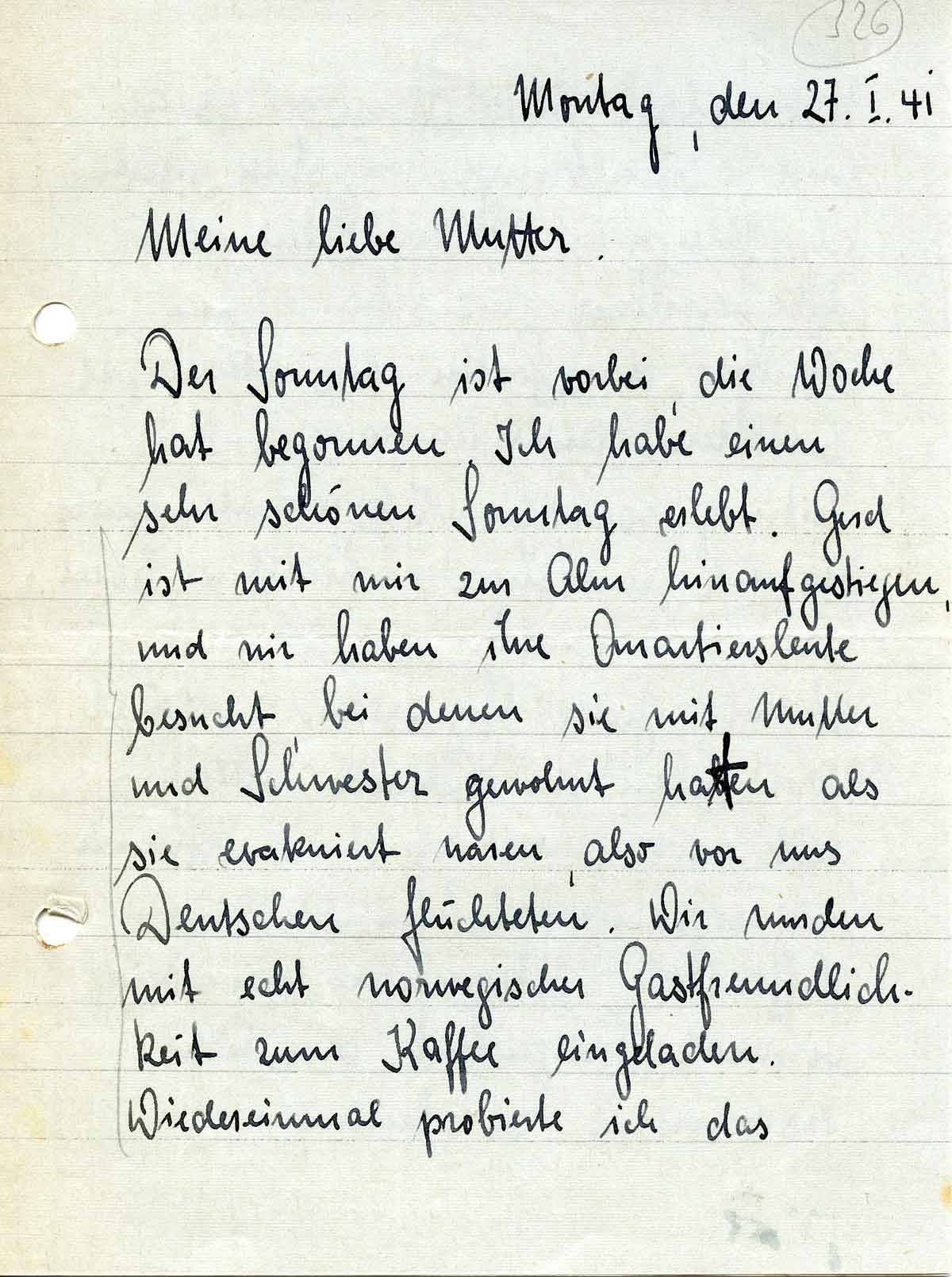 Der Sonntag ist vorbei, die Woche hat begonnen. Ich habe einen sehr schönen Sonntag erlebt. Gerd ist mit mir nur Alm hinaufgestiegen, und wir haben ihre Quartiersleute besucht, bei denen sie mit Mutter und Schwester gewohnt hat als sie evakuiert waren, also vor uns Deutschen flüchteten. Wir wurden mit echt norwegischer Gastfreundlichkeit zum Kaffee eingeladen.