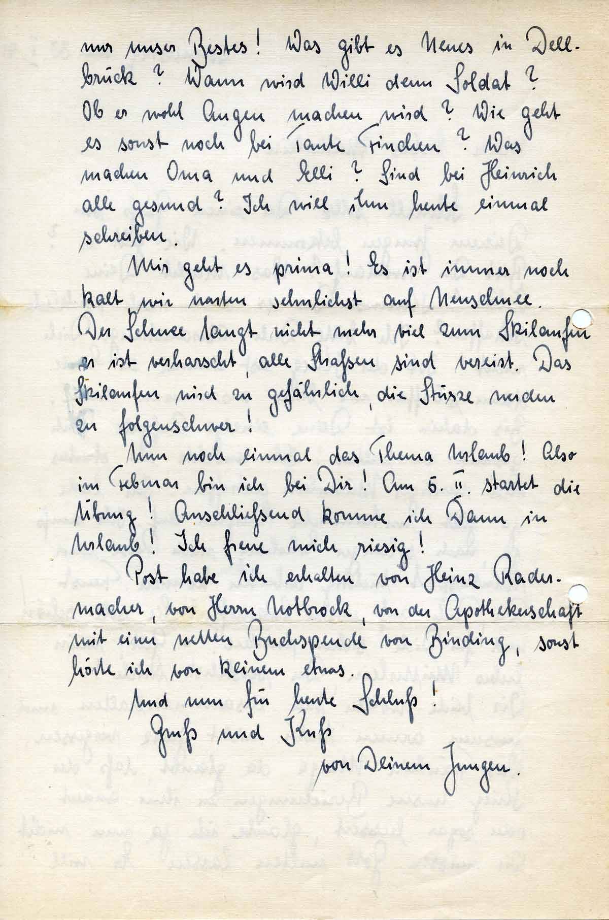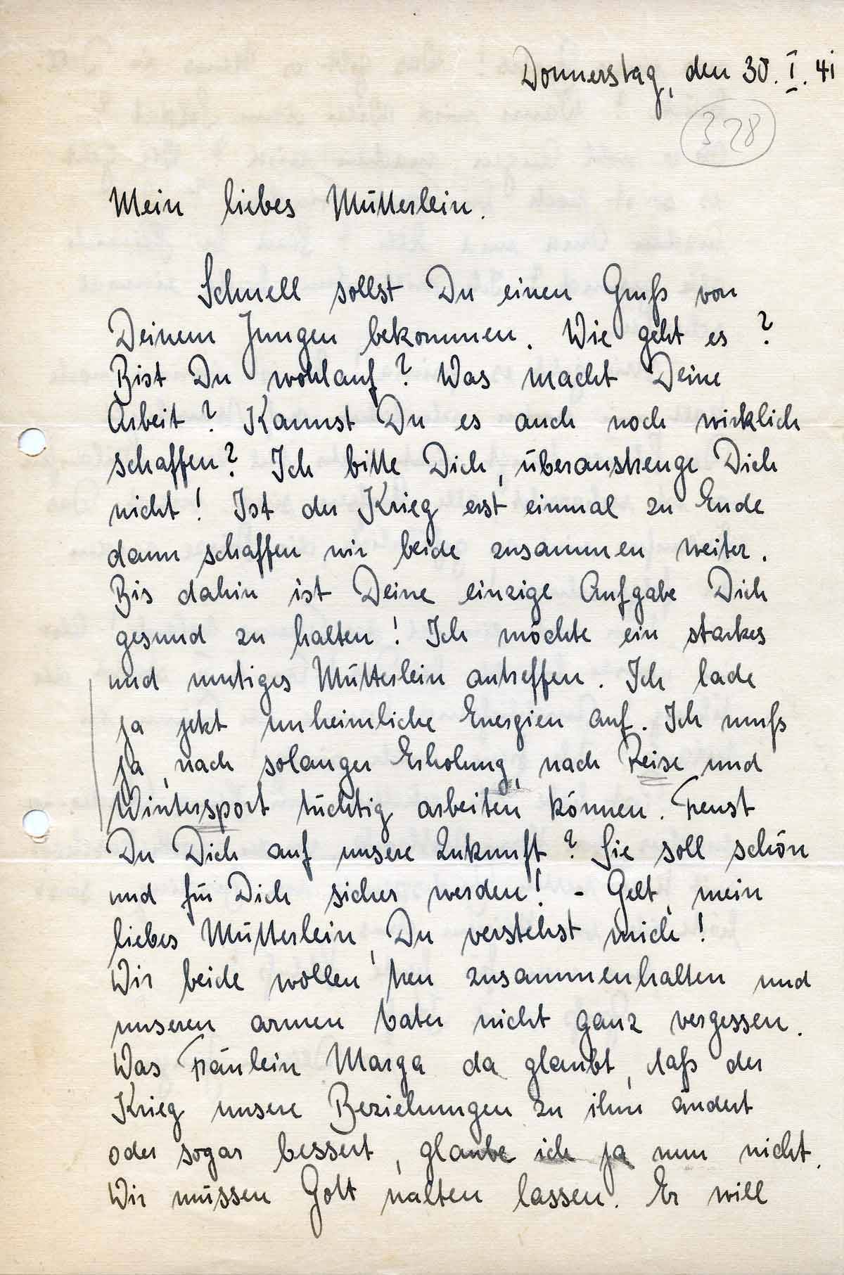 Schnell sollst Du einen Gruß von Deinem Jungen bekommen. Wie geht es? Bist Du wohlauf? Was macht Deine Arbeit? Kannst Du es auch noch wirklich schaffen? Ich bitte Dich, überanstrenge Dich nicht! Ist der Krieg erst einmal zu Ende dann schaffen wir beide zusammen weiter. Bis dahin ist Deine einzige Aufgabe Dich gesund zu halten! Ich möchte ein starkes und mutiges Mütterlein antreffen. Ich lade ja jetzt unheimliche Energien auf. Ich muß ja, nach solanger Erholung, nach Reise und Wintersport tüchtig arbeiten können. Freust Du Dich auf unsere Zukunft? Sie soll schön und für Dich sicher werden! – Gelt, mein liebes Mütterlein, Du verstehst mich!