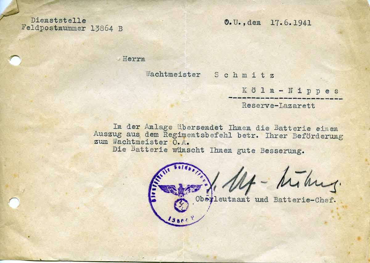 In der Anlage übersendet Ihnen die Batterie einen Auszug aus dem Regimentsbefehl betr. Ihrer Beförderung zum Wachtmeister O.A.