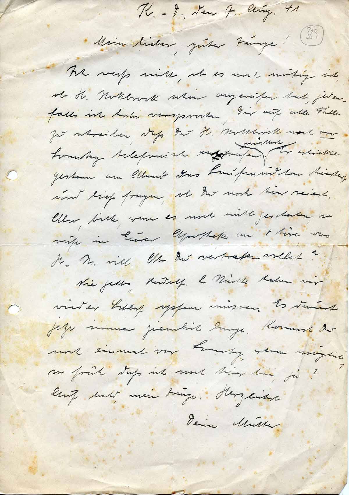 Ich weiß nicht, ob es noch nötig ist, ob H. Nottbrock schon angerufen hat, jedenfalls ich habe versprochen, Dir auf alle Fälle zu schreiben, daß Du H. Nottbrock noch vor Sonntag telefonisch anrufen möchtest. Er schickte gestern am Abend das Laufmädchen hierher, und ließ fragen, ob Du noch hier seiest. Also, bitte, wenn es noch nicht geschehen, so rufe in Eurer Apotheke an + höre was H. N. will. Ob Du vertreten sollst?