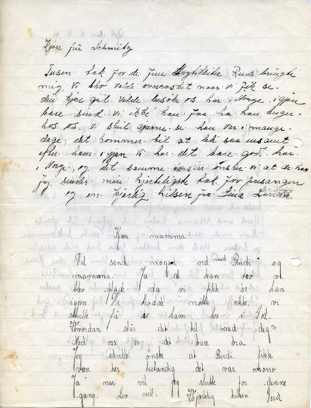 Vil sende nogen ord med Rudi og mamma. Ja de kan tao vi blev glade da vi fikk se han iqjen. Vi trodde nokk ikke, vi skulle fa se ham her i Got. Hvordan star det til med deg? Med oss er det bare bra. Jeg skulle önske at Rude fikk vare her bestandig det var morro Ja nu vil jeg slutte for glennegang. Lev vell.