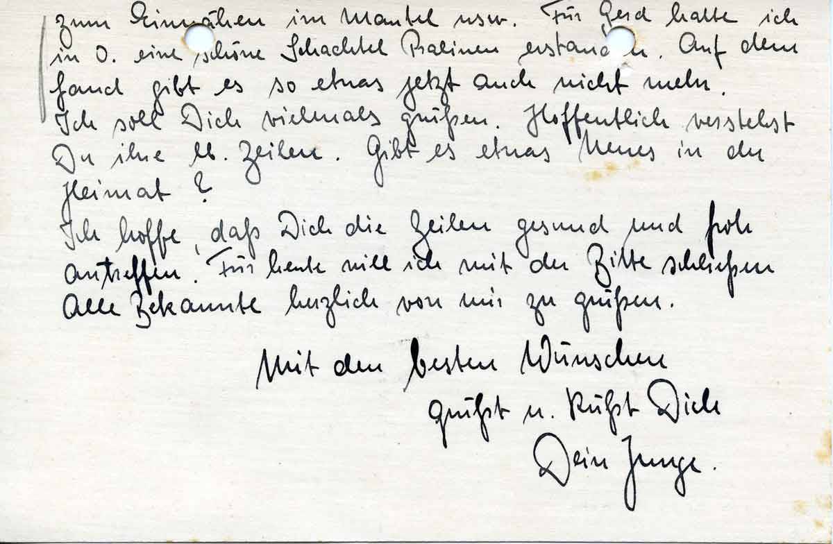 Ich hoffe, daß Dich die Zeilen gesund und froh antreffen. Für heute will ich mit der Bitte schließen Alle Bekannte herzlich von mir zu grüßen.