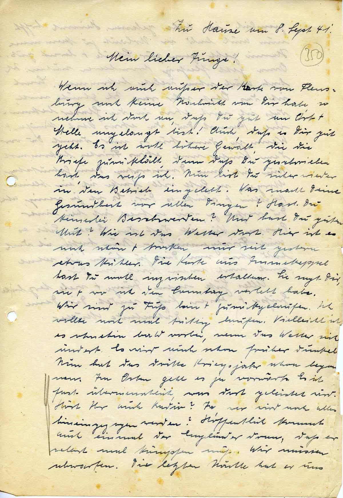 Wenn ich auch außer der Karte von Flensburg noch keine Nachricht von Dir habe, so nehme ich doch an, daß Du gut an Ort + Stelle angelangt bist! Auch, daß es Dir gut geht. Es ist wohl höhere Gewalt, die die Briefe zurückhält, denn daß Du geschrieben hast, das weiß ich. Nun bist Du sicher wieder in den Betrieb eingelebt. Was macht Deine Gesundheit vor allen Dingen? Hast Du keinerlei Beschwerden? Und hast Du guten Mut? Wie ist das Wetter dort. Hier ist es noch schön + trocken, nur seit gestern etwas kühler. Die Karte aus Immekeppel hast Du wohl inzwischen erhalten. Sie sagt Dir, wie + wo ich den Samstag verlebt habe. Wir sind zu Fuß hin + zurückgelaufen. Ich wollte noch mal tüchtig laufen. Vielleicht ist es ohnehin bald vorbei, wenn das Wetter sich ändert. Es wird auch schon früher dunkel. Nun hat das dritte Kriegsjahr schon begonnen. Im Osten geht es ja vorwärts. Es ist fast übermenschlich, was dort geleistet wird. Hört Ihr auch Radio? Ja, wer wird noch alles hineingezogen werden? Hoffentlich kommt auch einmal der Engländer dran, daß er selbst mal kämpfen muß. Wir müssen abwarten. Die letzten Nächte hat er uns