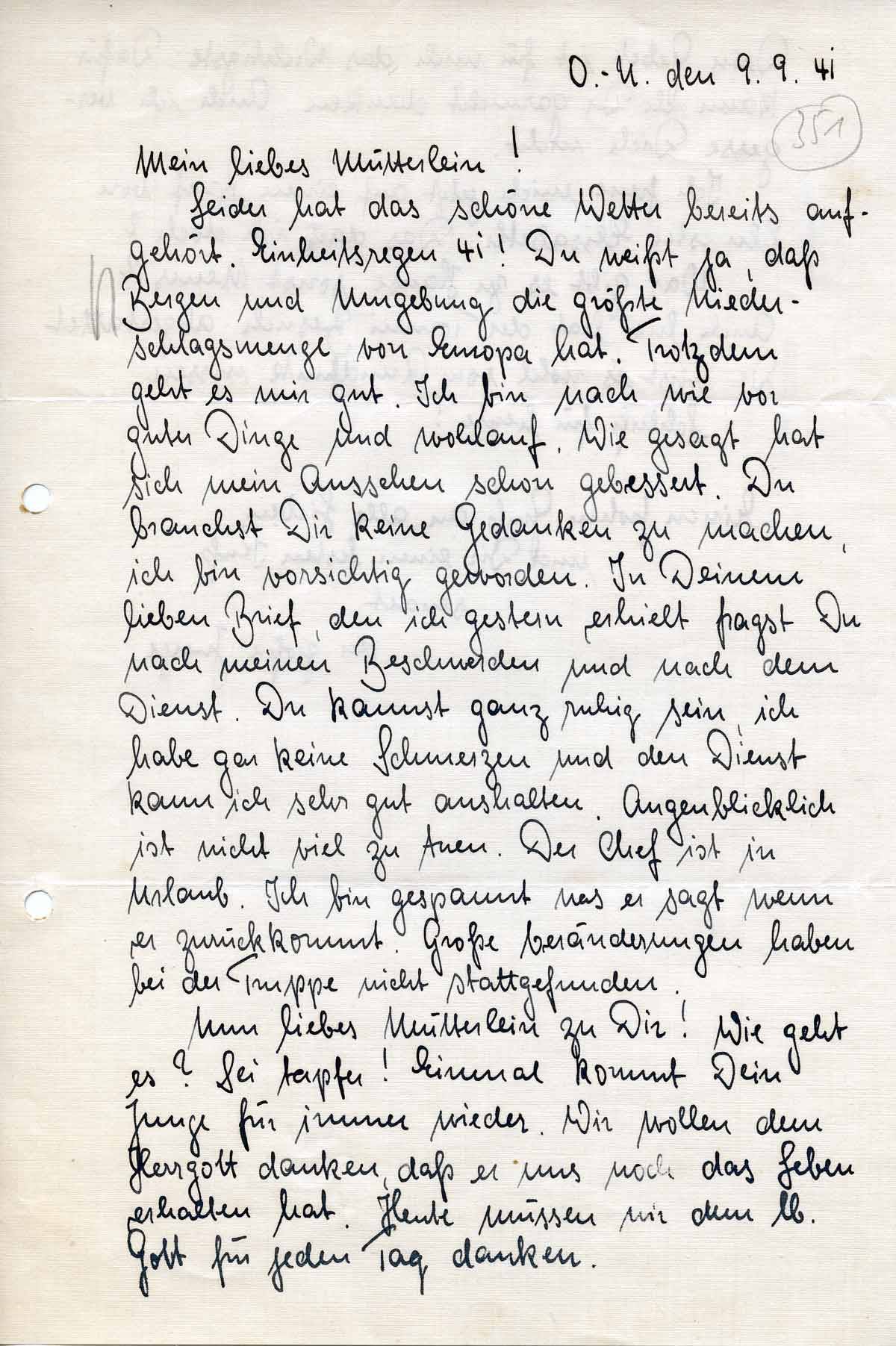 Leider hat das schöne Wetter bereits aufgehört. Einheitsregen 41! Du weißt ja, daß Bergen und Umgebung die größte Niederschlagsmenge von Europa hat. Trotzdem geht es mir gut. Ich bin nach wie vor guter Dinge und wohlauf. Wie gesagt hat sich mein Aussehen schon gebessert. Du brauchst Dir keine Gedanken zu machen, ich bin vorsichtig geworden. In Deinem lieben Brief, den ich gestern erhielt fragst Du nach meinen Beschwerden und nach dem Dienst. Du kannst ganz ruhig sein, ich habe gar keine Schmerzen und den Dienst kann ich sehr gut aushalten. Augenblicklich ist nicht viel zu tuen. Der Chef ist in Urlaub. Ich bin gespannt was er sagt wenn er zurückkommt. Große Veränderungen haben bei der Truppe nicht stattgefunden.