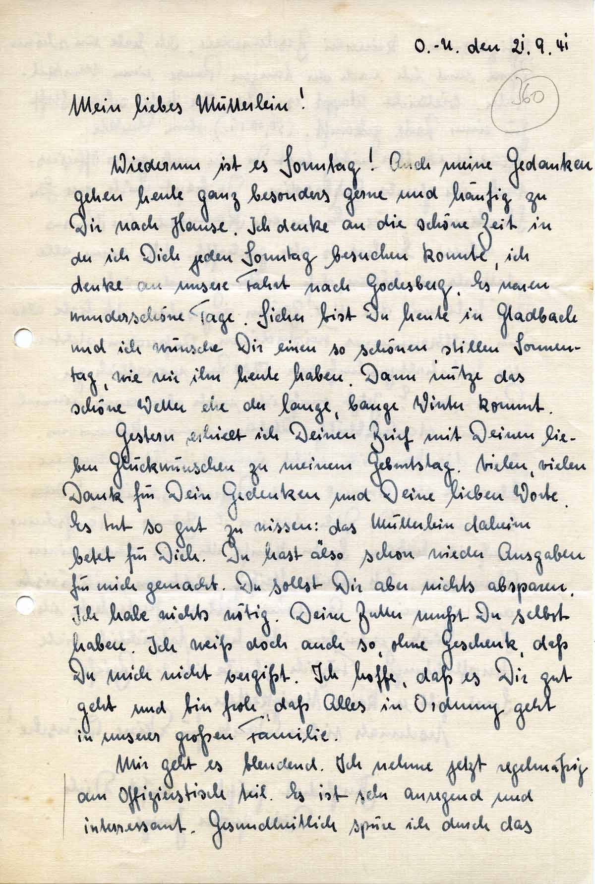 Gestern erhielt ich Deinen Brief mit Deinen lieben Glückwünschen zu meinem Geburtstag. Vielen, vielen Dank für Dein Gedenken und Deine lieben Worte. Es tut so gut zu wissen: das Mütterlein daheim betet für Dich. Du hast also schon wieder Ausgaben für mich gemacht. Du sollst Dir aber nichts absparen. Ich habe nichts nötig. Deine Butter mußt Du selbst haben. Ich weiß doch auch so, ohne Geschenk, daß Du mich nicht vergißt. Ich hoffe, daß es Dir gut geht und bin froh, daß Alles in Ordnung geht in unserer großen Familie.