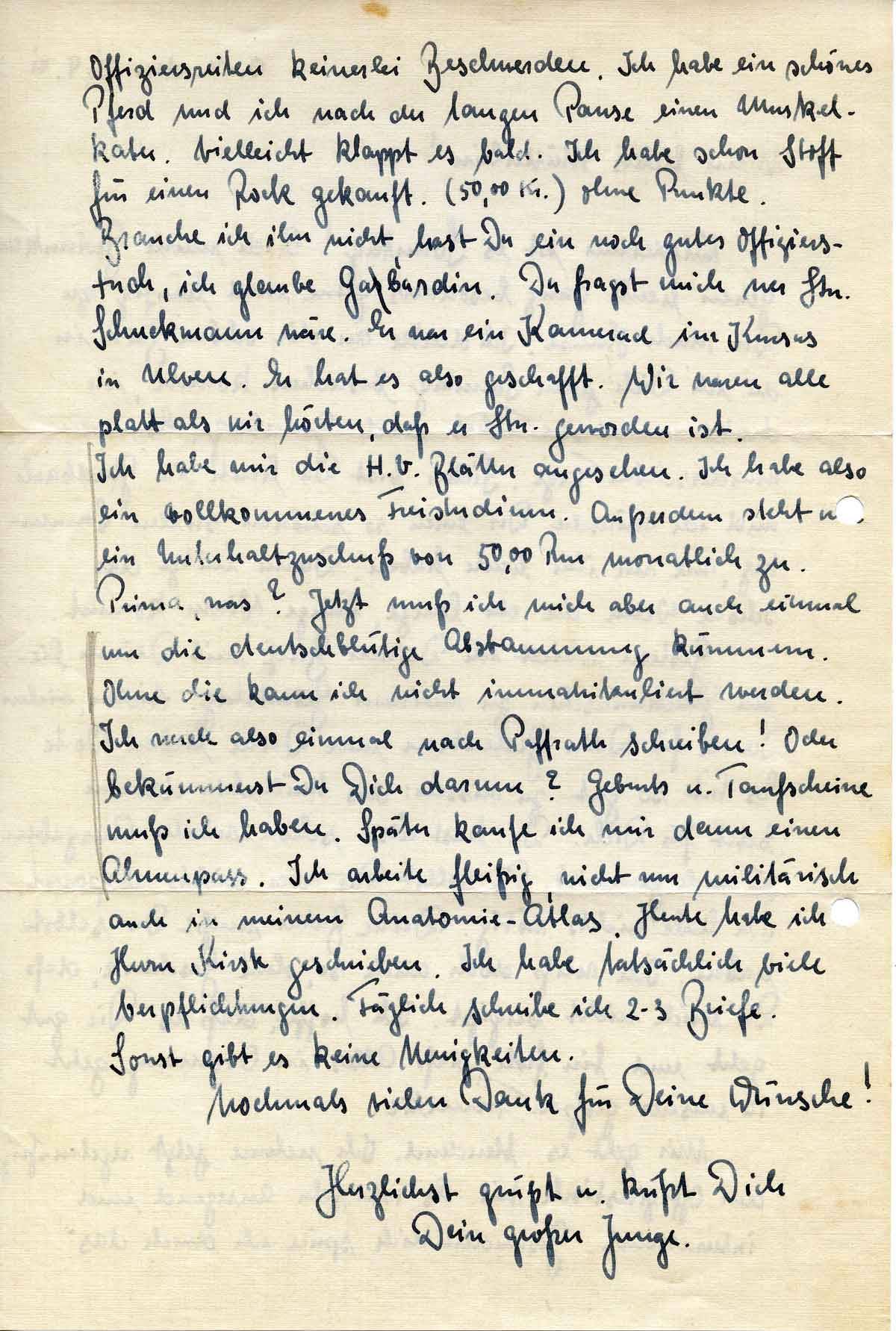 Ich habe mir die H.V. Blätter angesehen. Ich habe also ein vollkommenes Freistudium. Außerdem steht mir ein Unterhaltszuschuß von 50,00 Rm monatlich zu. Prima, was? Jetzt muß ich mich aber auch einmal um die deutschblütige Abstammung kümmern. Ohne die kann ich nicht immatrikuliert werden. Ich werde also einmal nach Paffrath schreiben! Oder bekümmerst Du Dich darum? Geburts u. Taufscheine muß ich haben. Später kaufe ich mir dann einen Ahnenpasse. Ich arbeite fleißig, nicht nur militärisch auch in meinem Anatomie-Atlas. Heute habe ich Herrn Kirst geschrieben. Ich habe tatsächlich viele Verpflichtungen. Täglich schreibe ich 2-3 Briefe. Sonst gibt es keine Neuigkeiten.