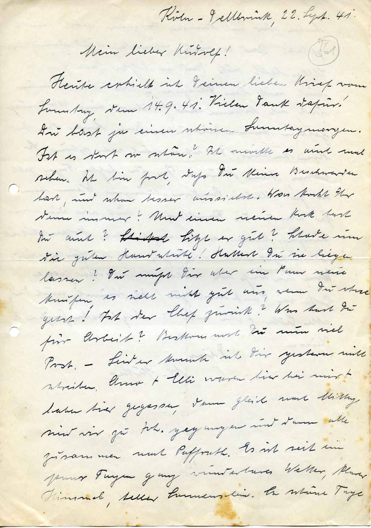 Heute erhielt ich Deinen lieben Brief vom Sonntag, dem 14.9.41. Vielen Dank dafür! Du hast ja einen schönen Sonntagmorgen. Ist es dort so schön? Ich möchte es auch mal sehen. Ich bin froh, daß Du keine Beschwerden hast, und schon besser aussiehst. Was kocht Ihr denn immer? Und einen neuen Rock hast Du auch? Sitzt er gut? Schade um die guten Handschuhe! Hattest Du sie liegen lassen? Du mußt Dir aber ein Paar neue kaufen, es sieht nicht gut aus, wenn Du ohne gehst! Ist der Chef zurück? Was hast Du für Arbeit? Bekommst Du nun viel Post. – Leider konnte ich Dir gestern nicht schreiben. Oma + Elli waren hier bei mir + haben hier gegessen, dann gleich nach Mittag sind wir zu Joh. gegangen und dann alle zusammen nach Paffrath. Es ist seit ein paar Tagen ganz wunderbares Wetter, klarer Himmel, heller Sonnenschein. So schöne Tage