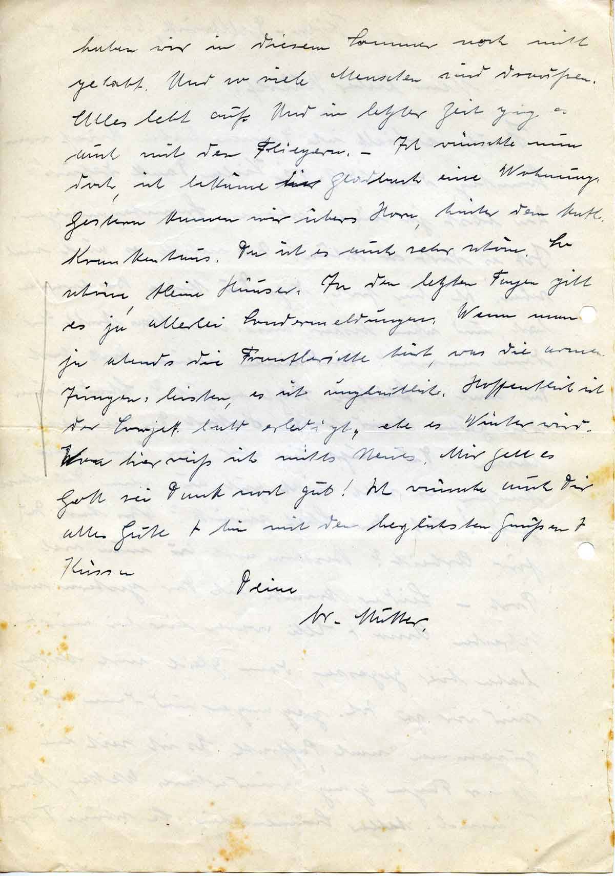 haben wir in diesem Sommer noch nicht gehabt. Und so viele Menschen sind draußen. Alles lebt auf. Und in letzter Zeit ging es auch mit den Fliegern. – Ich wünschte nun doch, ich bekäme in Gladbach eine Wohnung. Gestern kamen wir übers Horn, hinter dem kath. Krankenhaus. Da ist es auch sehr schön. So schöne, kleine Häuser. In den letzten Tagen gibt es ja allerlei Sondermeldungen. Wenn man ja abends die Frontberichte hört, was die armen Jungen leisten, es ist unglaublich. Hoffentlich ist der Sowjet bald erledigt, ehe es Winter wird. Von hier weiß ich nichts Neues. Mir geht es Gott sei Dank noch gut! Ich wünsche auch Dir alles Gute + bin mit den herzlichsten Grüßen + Küssen