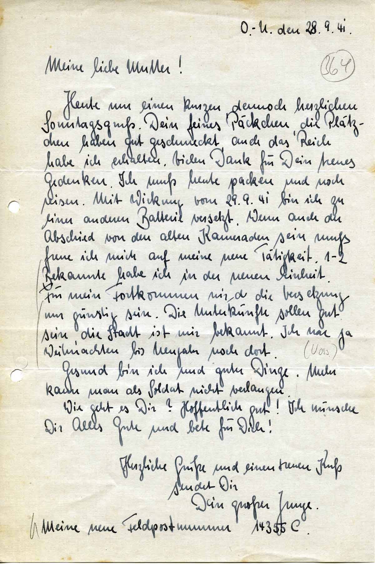 Heute nur einen kurzen, dennoch herzlichen Sonntagsgruß. Dein feines Päckchen, die Plätzchen haben gut geschmeckt, auch das Reich habe ich erhalten. Vielen Dank für Dein treues Gedenken. Ich muß heute packen und noch reisen. Mit Wirkung vom 29.9.41 bin ich zu einer anderen Batterie versetzt. Wenn auch der Abschied von den alten Kameraden sein muß freue ich mich auf meine neue Tätigkeit. 1-2 Bekannte habe ich in der neuen Einheit. Für mein Fortkommen wird die Versetzung nur günstig sein. Die Unterkünfte sollen gut sein, die Stadt ist mir bekannt. Ich war ja Weihnachten bis Neujahr noch dort.