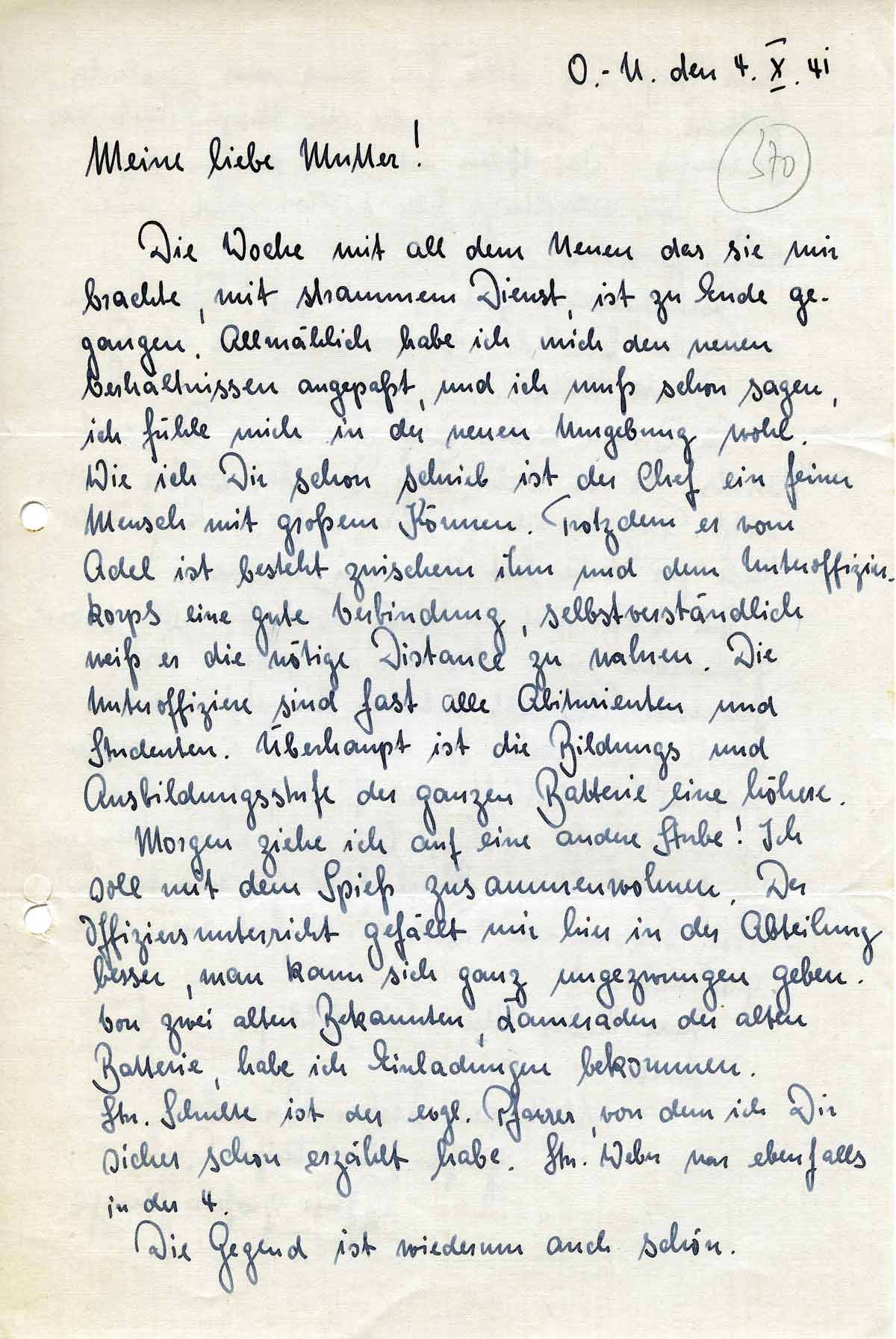 Die Woche mit all dem Neuen das sie mir brachte, mit strammem Dienst, ist zu Ende gegangen. Allmählich habe ich mich den neuen Verhältnissen angepaßt, und ich muß schon sagen, ich fühle mich in der neuen Umgebung wohl. Wie ich Dir schon schrieb ist der Chef ein feiner Mensch mit großem Können. Trotzdem er vom Adel ist besteht zwischen ihm und dem Unteroffizierkorps eine gute Verbindung, selbstverständlich weiß er die nötige Distance zu wahren. Die Unteroffiziere sind fast alle Abiturienten und Studenten. Überhaupt ist die Bildungs und Ausbildungsstufe der ganzen Batterie eine höhere.