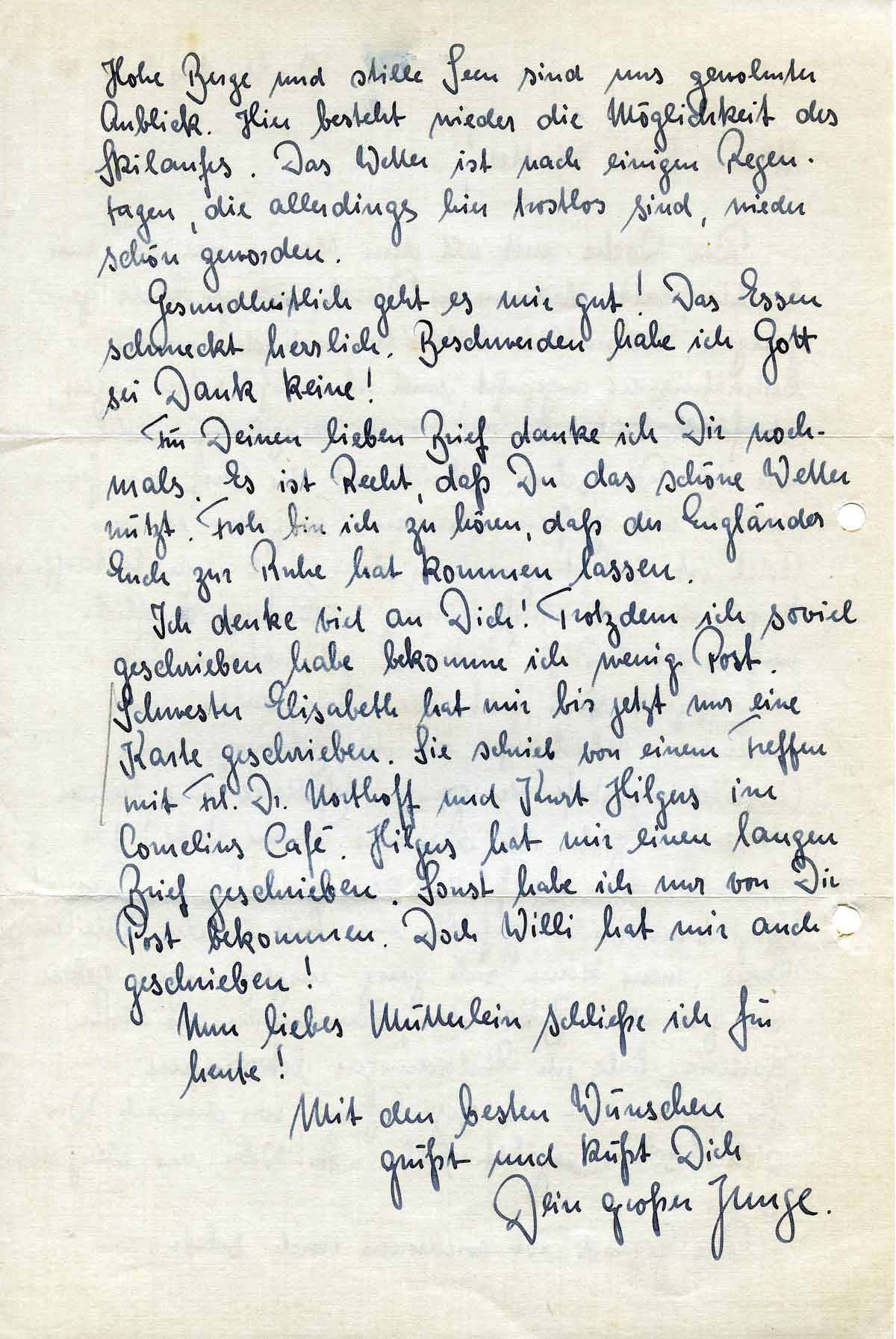 Ich denke viel an Dich! Trotzdem ich soviel geschrieben habe bekomme ich wenig Post. Schwester Elisabeth hat mir bis jetzt nur eine Karte geschrieben. Sie schrieb von einem Treffen mit Frl. Dr. Northoff und Kurt Hilgers im Cornelius Café. Hilgers hat mir einen langen Brief geschrieben. Sonst habe ich nur von Dir Post bekommen. Doch Willi hat mir auch geschrieben!