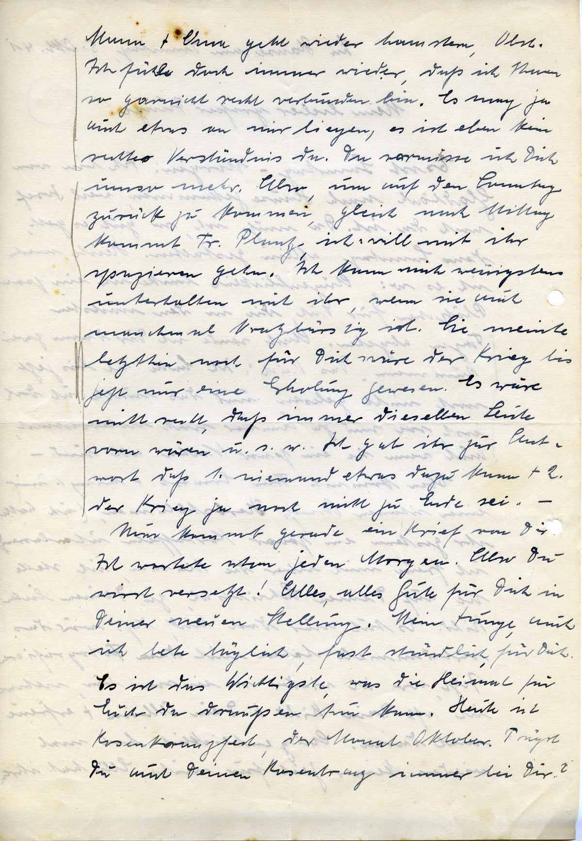 Mann + Oma geht wieder hamstern, Obst. Ich fühle doch immer wieder, daß ich [..] so garnicht recht verbunden bin. Es mag ja auch etwas an mir liegen, es ist eben kein rechtes Verständnis da. Da vermisse ich Dich umso mehr. Also, um auf den Sonntag zurück zu kommen, gleich nach Mittag kommt Fr. Plantz, ich will mit ihr spazieren gehen. Ich kann mich wenigstens unterhalten mit ihr, wenn sie auch manchmal kratzbürstig ist. Sie meinte letzthin noch für Dich wäre der Krieg bis jetzt nur eine Erholung gewesen. Es wäre nicht recht, daß immer dieselben Leute vorn wären u. s. w. Ich gab ihr zur Antwort daß 1. niemand etwas dazu kann + 2. der Krieg ja noch nicht zu Ende sei. –