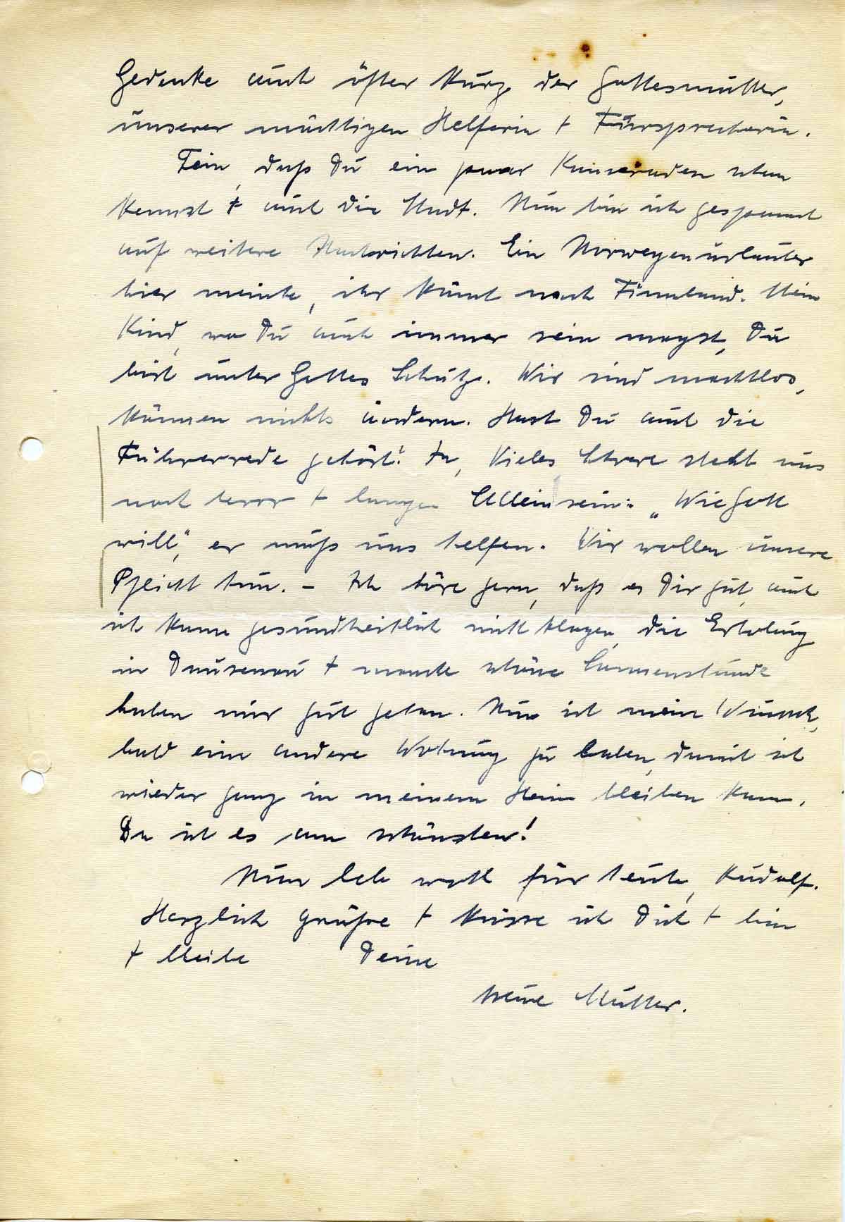 Fein, daß Du ein paar Kameraden schon kennst + auch die Stadt. Nun bin ich gespannt auf weitere Nachrichten. Ein Norwegenurlauber hier meinte, ihr kämt nach Finnland. Mein Kind, wo Du auch immer sein magst, Du bist unter Gottes Schutz. Wir sind machtlos, können nichts ändern. Hast Du auch die Führerrede gehört? Ja, Vieles Schwere steht uns noch bevor + langes Alleinsein. „Wie Gott will“, er muß uns helfen. Wir wollen unsere Pflicht tun. – Ich höre gern, daß es Dir gut, auch ich kann gesundheitlich nicht klagen, die Erholung in Dausenau + manche schöne Sonnenstunde haben mir gut getan. Nun ist mein Wunsch, bald eine andere Wohnung zu haben, damit ich wieder ganz in meinem Heim bleiben kann. Da ist es am schönsten!