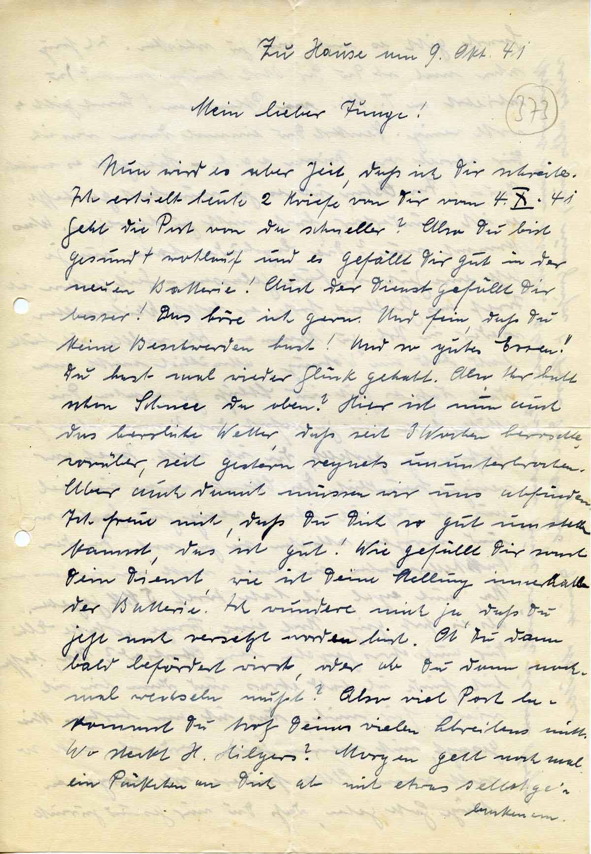Nun wird es aber Zeit, daß ich Dir schreibe. Ich erhielt heute 2 Briefe von Dir vom 4.X.41. Geht die Post von da schneller? Also Du bist gesund + wohlauf und es gefällt Dir gut in der neuen Batterie! Auch der Dienst gefällt Dir besser! Das höre ich gern. Und fein, daß Du keine Beschwerden hast! Und so gutes Essen! Du hast mal wieder Glück gehabt. Also Ihr habt schon Schnee da oben? Hier ist nun auch das herrliche Wetter, daß seit 3 Wochen herrschte, vorüber, seit gestern regnets ununterbrochen. Aber auch damit müssen wir uns abfinden. Ich freue mich, daß Du Dich so gut umstellen kannst, das ist gut! Wie gefällt Dir sonst Dein Dienst, wie ist Deine Stellung innerhalb der Batterie. Ich wundere mich ja, daß Du jetzt noch versetzt worden bist. Ob Du dann bald befördert wirst, oder ob Du dann nochmal wechseln mußt? Also viel Post bekommst Du trotz Deines vielen Schreibens nicht. Wo steckt H. Hilgers? Morgen geht noch mal ein Päckchen an Dich ab mit etwas selbstgebackenem.