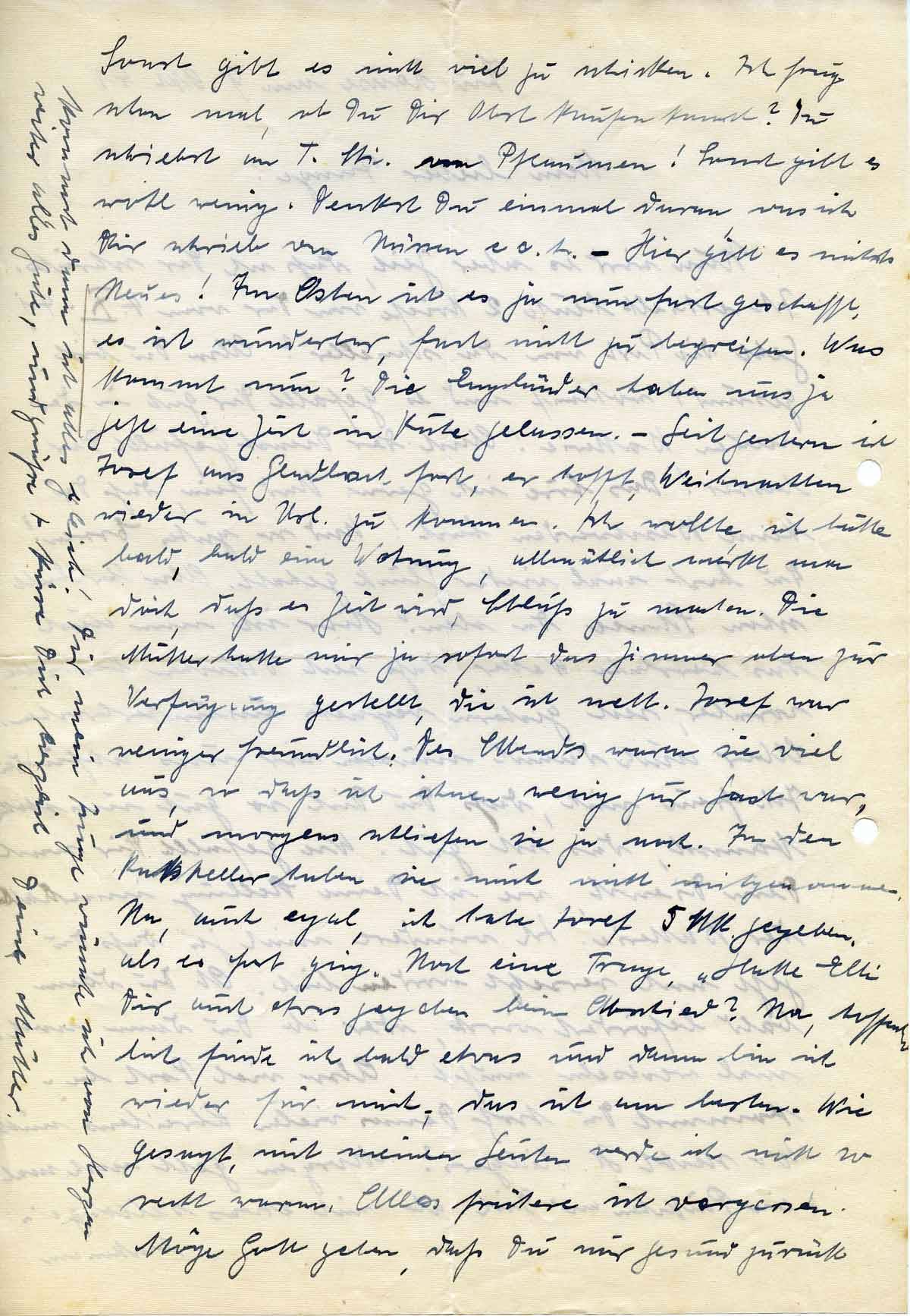 Sonst gibt es nicht viel zu schicken. Ich frug schon mal, ob Du Dir Obst kaufen kannst? Du schriebst an T. Sti. von Pflaumen! Sonst gibt es wohl wenig. Denkst Du einmal daran, was ich Dir schrieb von Nüssen ect. – Hier gibt es nichts Neues! Im Osten ist es ja nun fast geschafft, es ist wunderbar, fast nicht zu begreifen. Was kommt nun? Die Engländer haben uns ja jetzt eine Zeit in Ruhe gelassen. – Seit gestern ist Josef aus Gladbach fort, er hofft, Weihnachten wieder in Url. zu kommen. Ich wollte, ich hätte bald, bald eine Wohnung, allmählich merkt man doch, daß es Zeit wird, Schluß zu machen. Die Mutter hatte mir ja sofort das Zimmer oben zur Verfügung gestellt, die ist nett. Josef war weniger freundlich. Des Abends waren sie viel aus, so daß ich ihnen wenig zur Last war, und morgens schliefen sie ja noch. In den Ratskeller haben sie mich nicht mitgenommen. Na, auch egal, ich habe Josef 5 Mk. gegeben als er fort ging. Noch eine Frage, „Hatte Elli Dir auch etwas gegeben beim Abschied? Na, hoffentlich finde ich bald etwas und dann bin ich wieder für mich, das ist am besten. Wie gesagt, mit meinen Leuten werde ich nicht so recht warm. Alles frühere ist vergessen. Möge Gott geben, daß Du mir gesund zurück